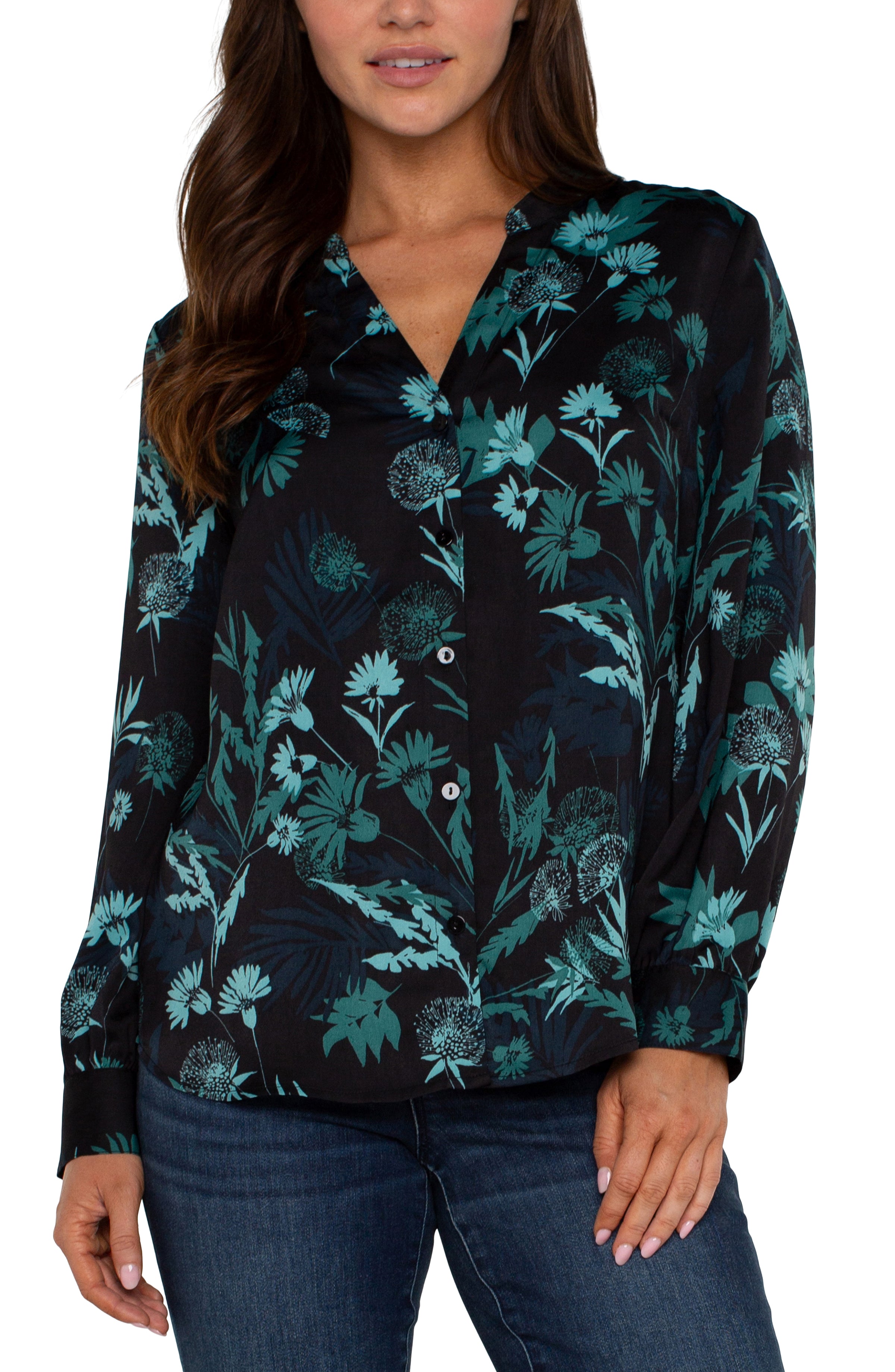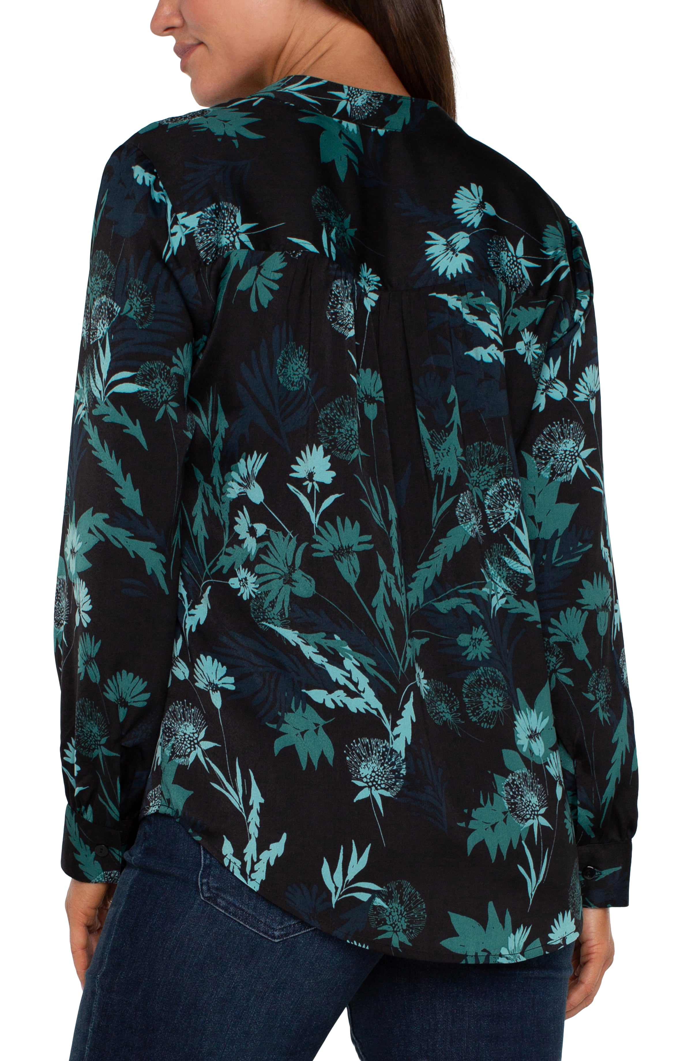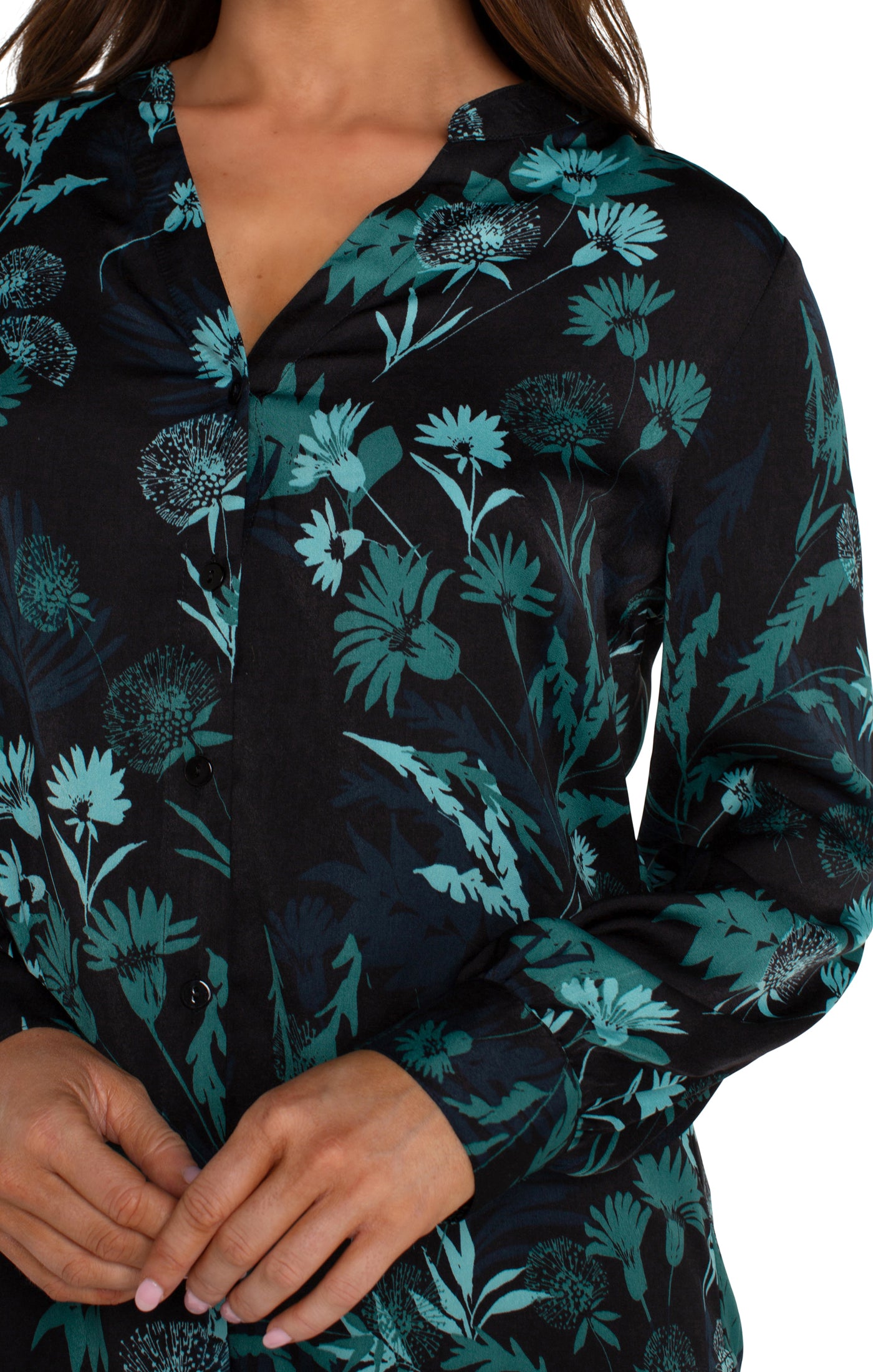 Long Sleeve Button Front Banded Collar Woven Shirt