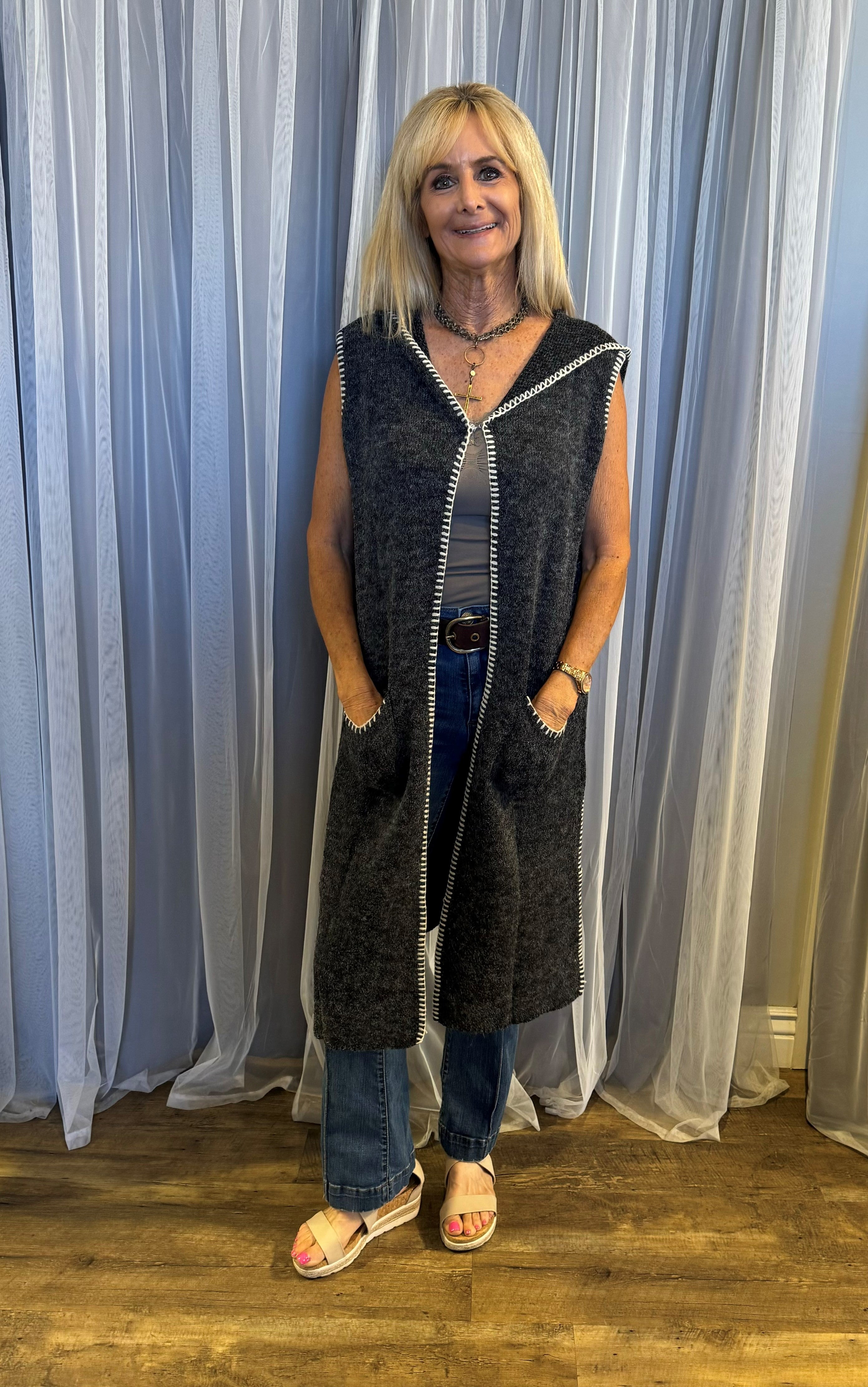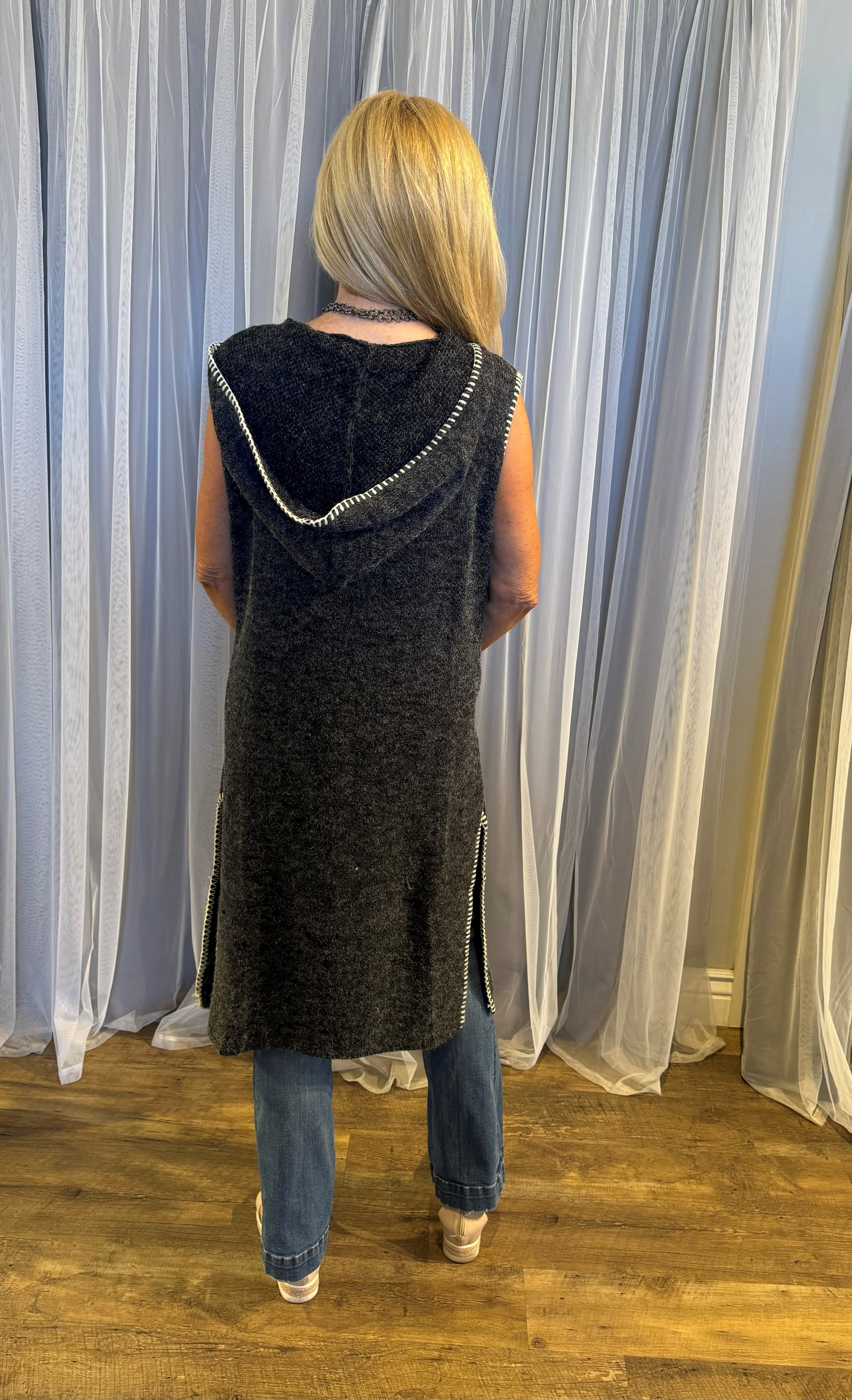 Heathered Long Sweater Vest w/Hood. Side Slits and Front Pockets. Stitch Detail. 100% Acrylic.