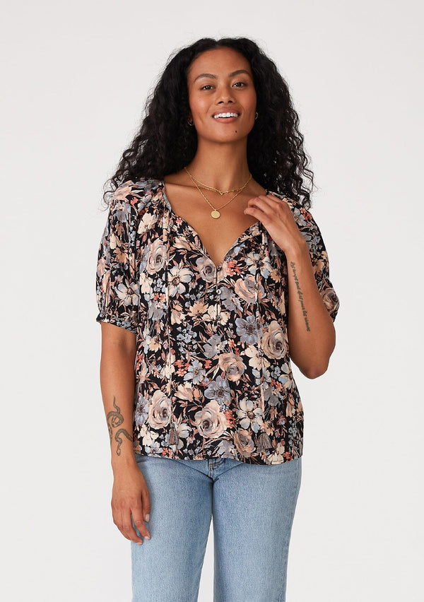Vintage-inspired florals add a romantic touch to this classic bohemian blouse. Featuring short puff sleeves and a flattering split v-neckline with tassel ties. A versatile style for any season, we love to tuck it into our favorite vintage denim.