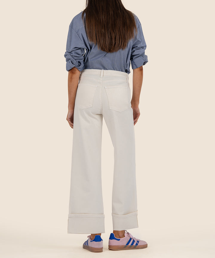 Meg High Rise Fab Ab Wide Legs Roll Up. Inseam Before Roll Up: 31 3/4". Inseam After Roll Up: 27 3/4". 98% Cotton, 2% Spandex.