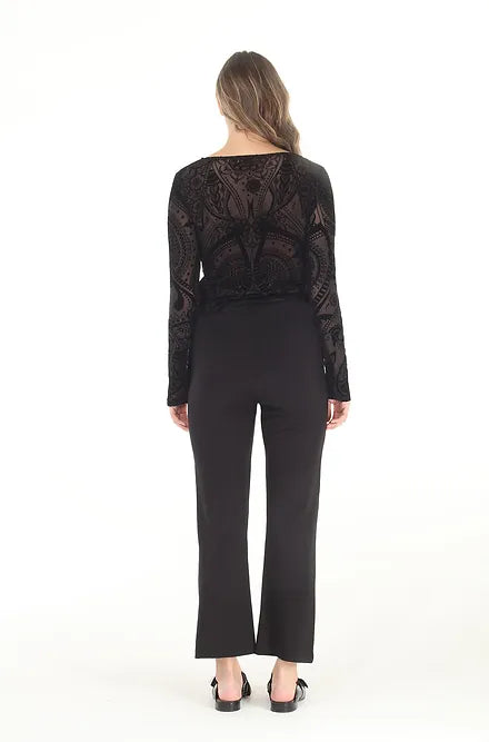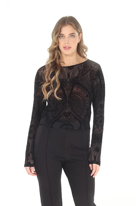 Mesh Burnout Crop Top. Straight Hem. Ballet Neckline. 95% Polyester, 5% Spandex.