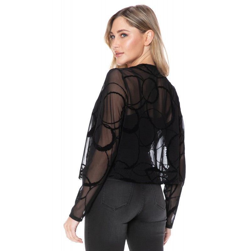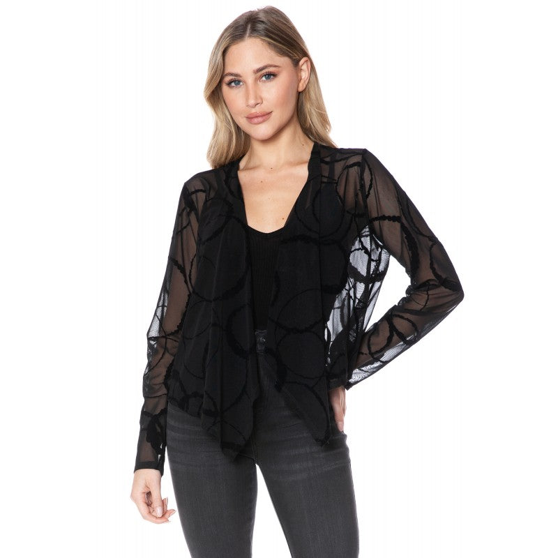 Long Sleeve Mesh Burnout Cover Up Jacket. 96% Polyester, 4% Spandex.
