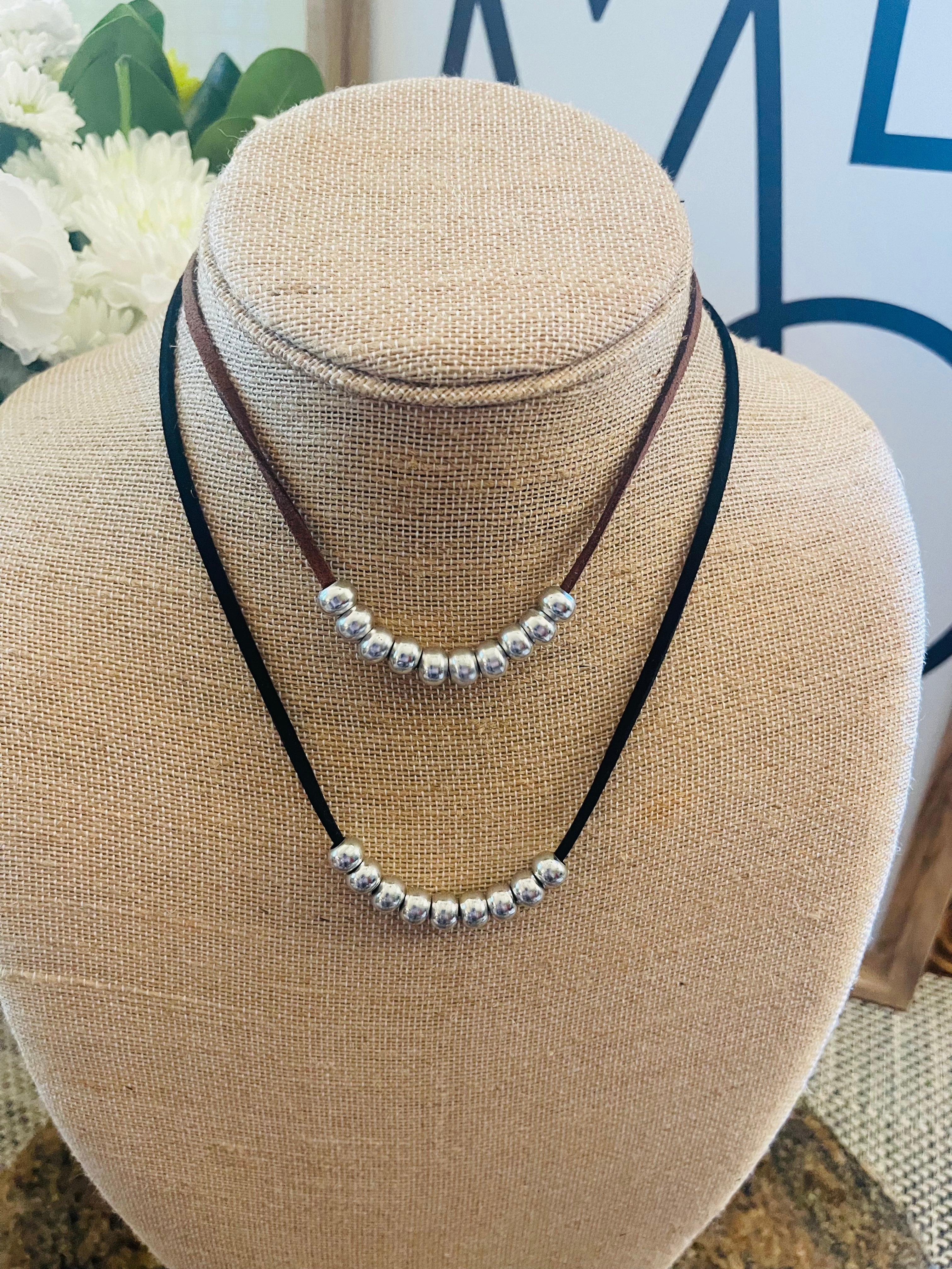 Metal Beaded Choker Adjustable Leather w/Extension