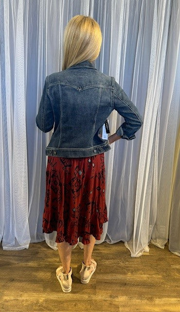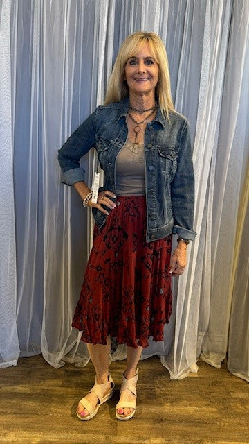 100% Rayon. Midi Length Tiered Ruffle Skirt. Elastic Waistband.