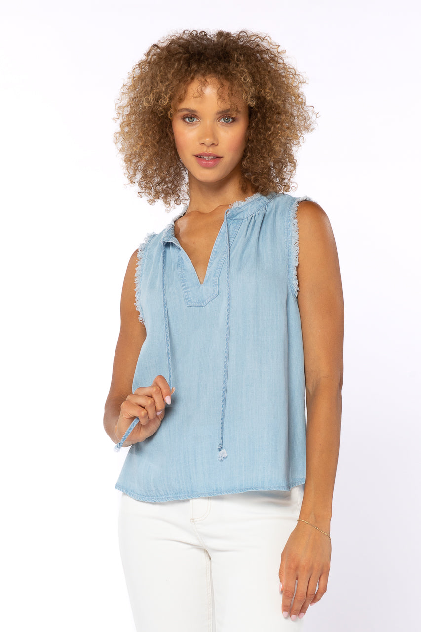 Mireille Sleeveless Split Neck w/ Tie and Fray Details
