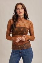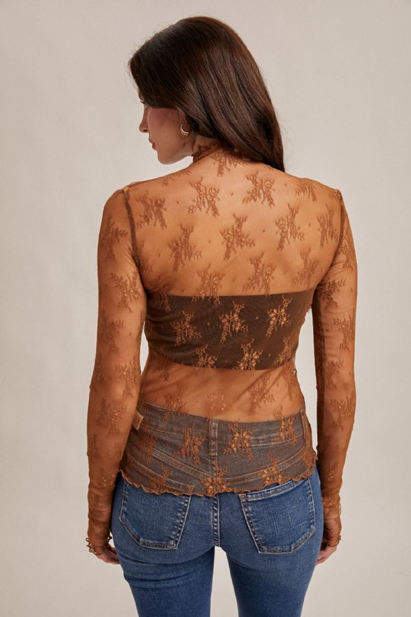 Long Sleeved Mock Neck Lace Top w/Thumb Holes. 90% Nylon, 10% Spandex.