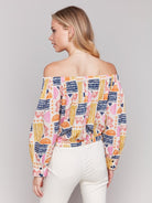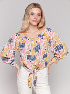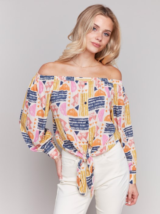 Off-Shoulder Printed Blouse w/ Front Tie
