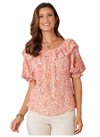 Open Round Neck Printed Woven Top w/ Double Ruffle Edge Sleeve