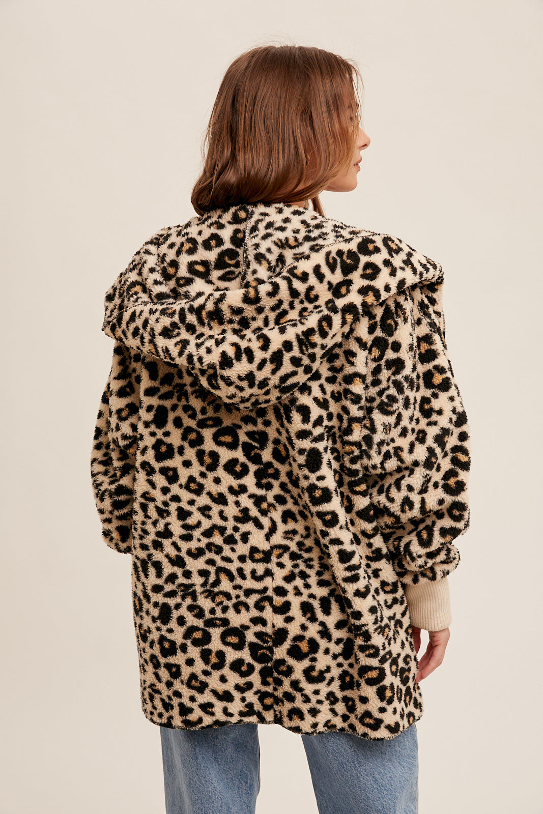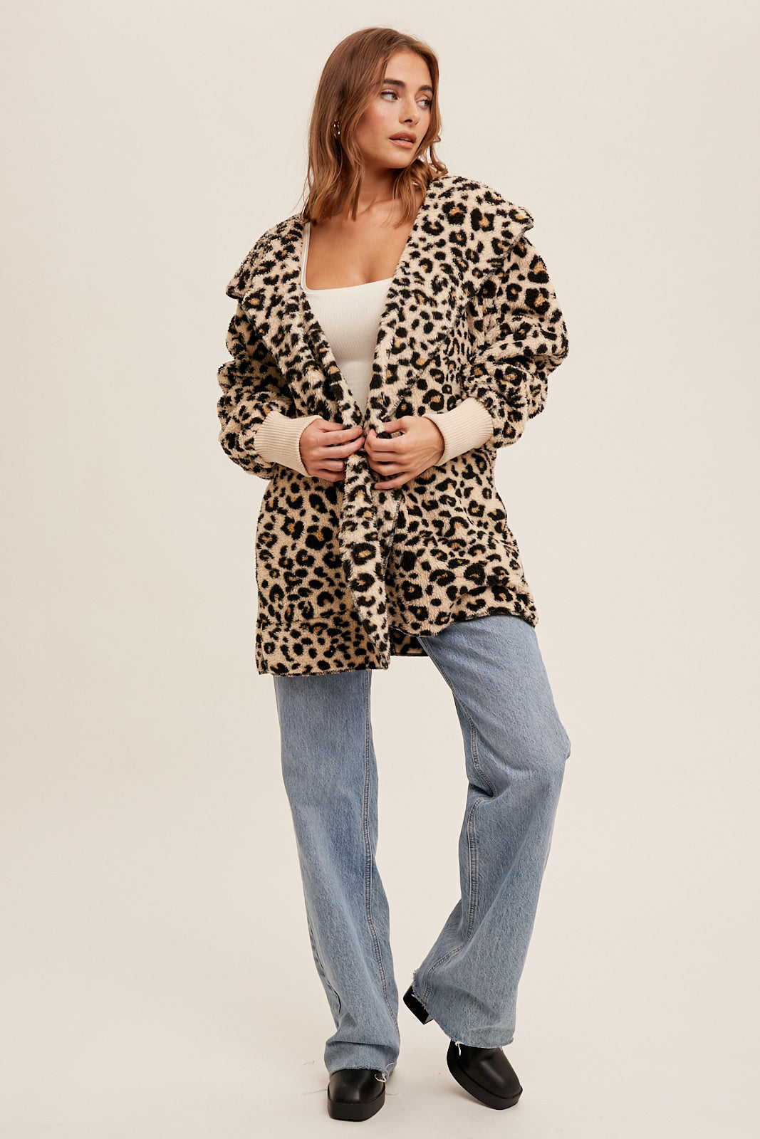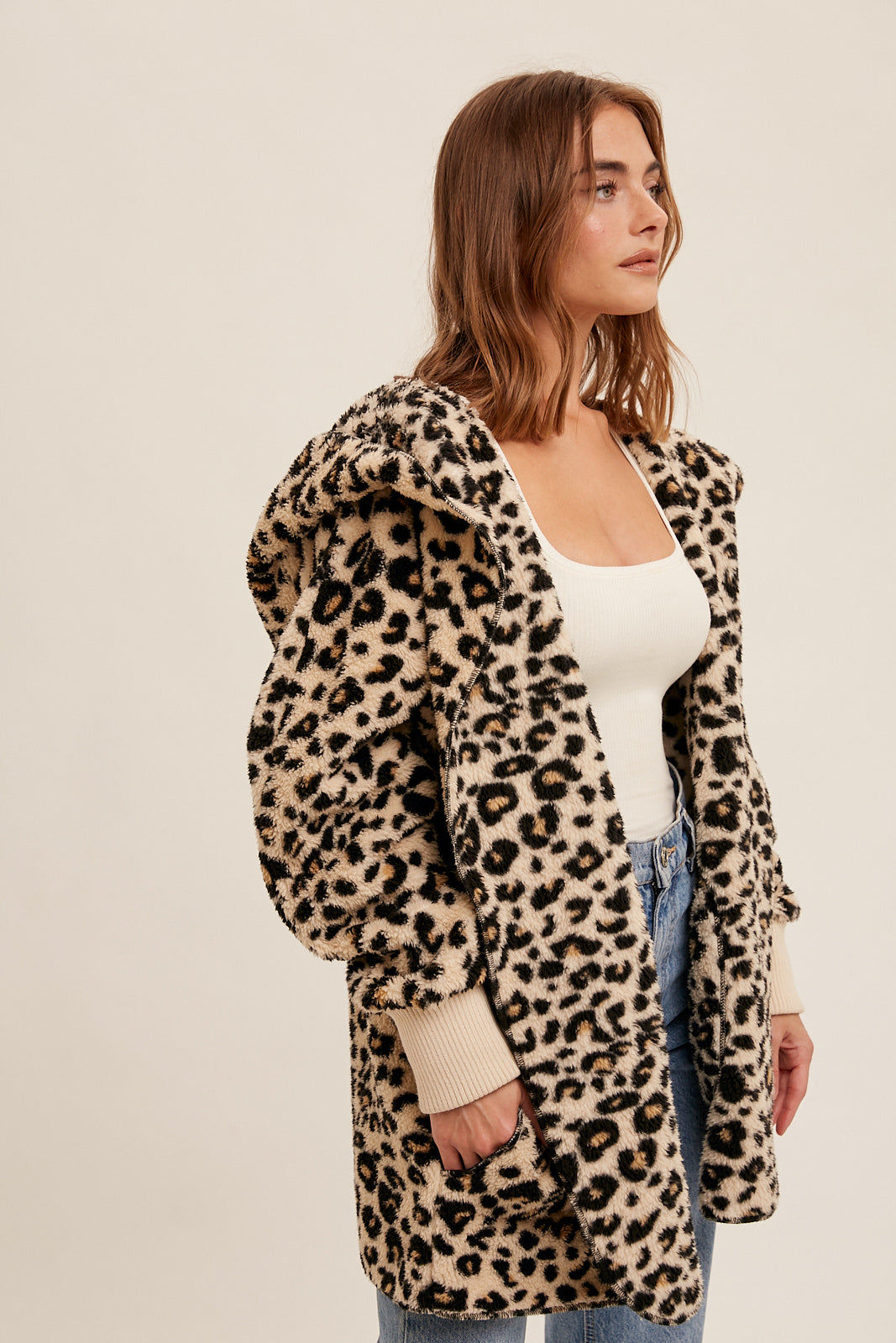 Soft Leopard Print Fur Open Sherpa Jacket. 100% Polyester.