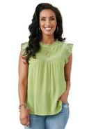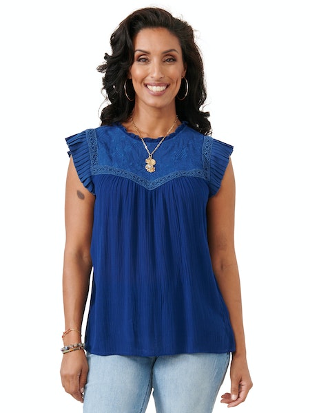 Pleated Sleeve Ruffle Neck Mixed Media Top