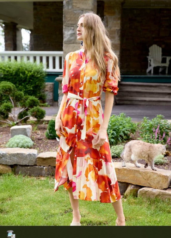 Midi Length Woven Dress w/Ruffle Hem. Button Down w/Tie Belt. 3/4 Sleeve w/Elastic. 100% Rayon.