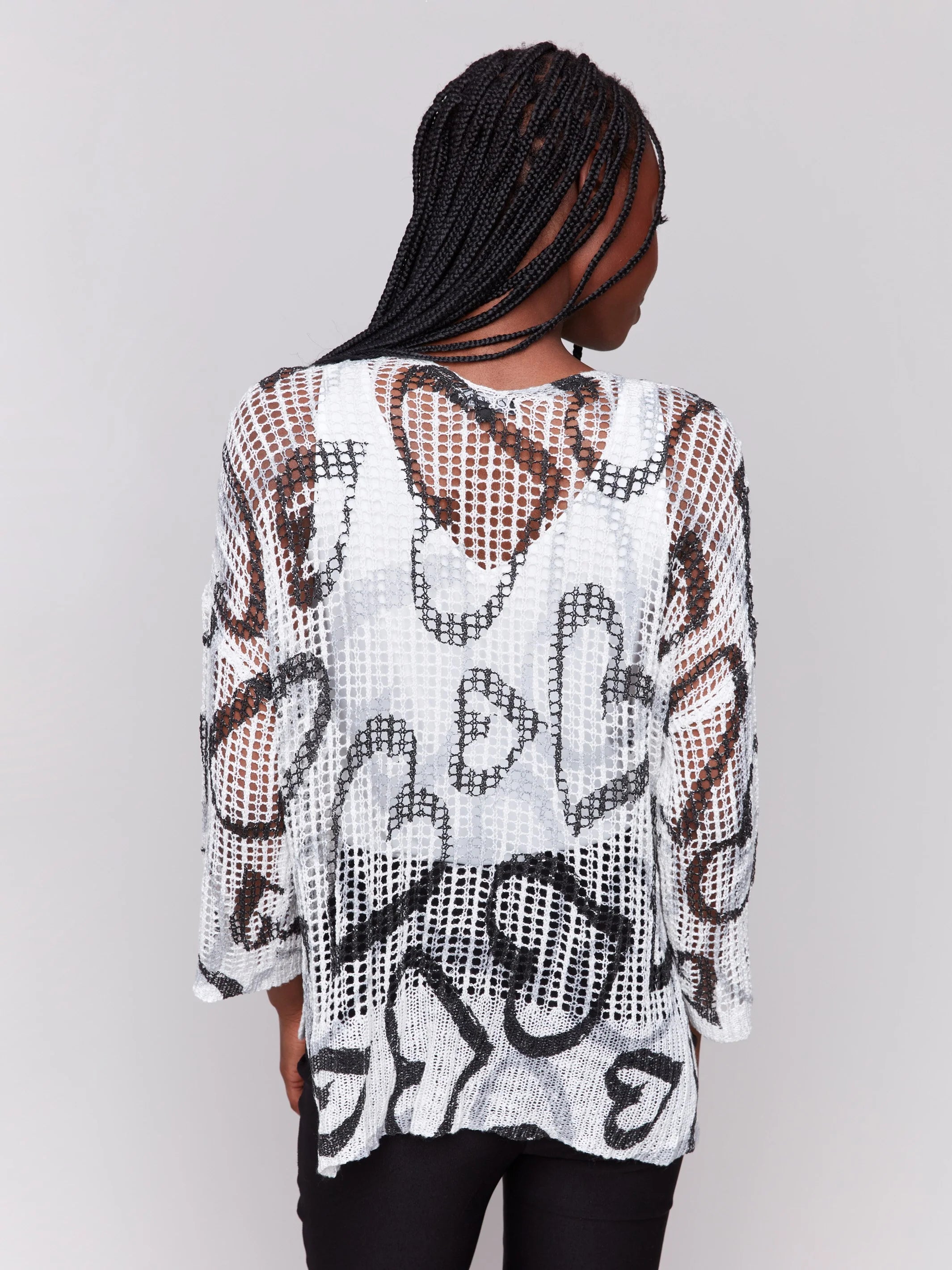 Sport a creative allure with this loose V-neck crochet sweater. Its delightful hearts print and airy fishnet texture make it a must-have for stylish layering on warm spring and summer days.