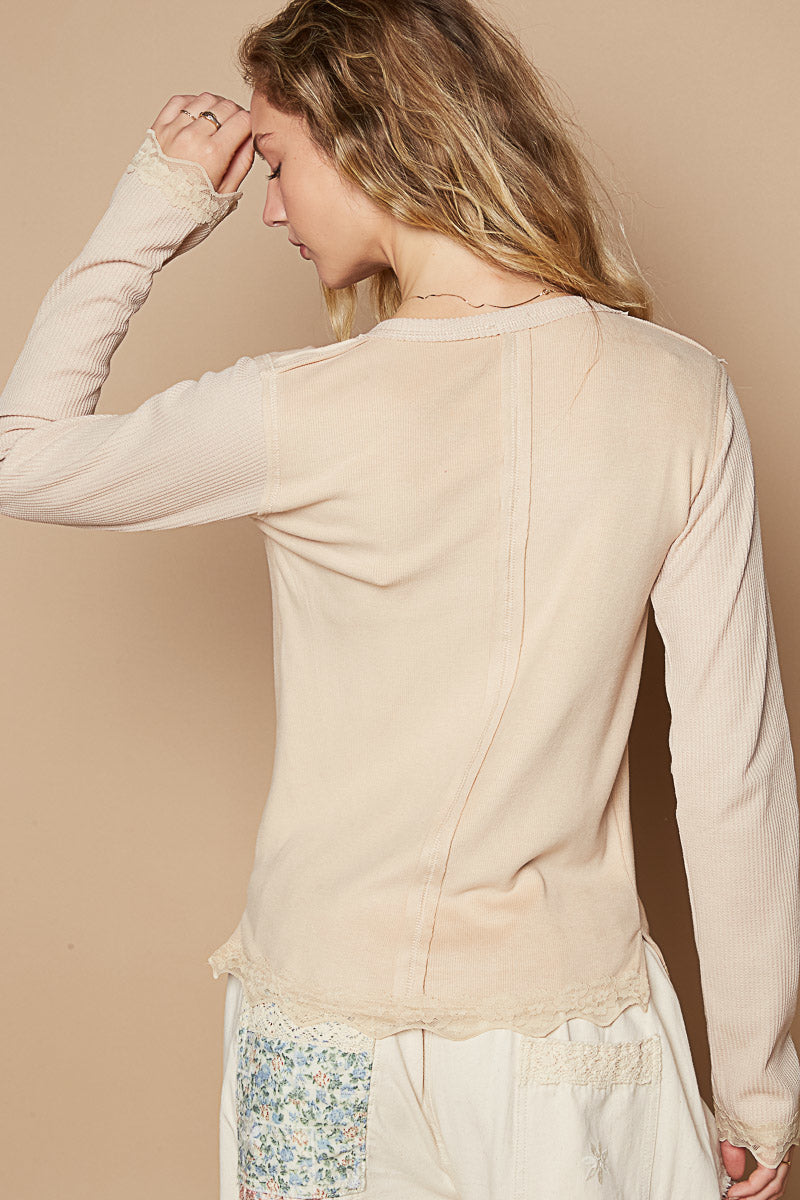 Round neck, full sleeve, fitted top in rib and thermal mix with lace trim detail pointed solid pattern. Self: 96% Rayon, 4% Spandex. Contrast: 62% Polyester, 33% Cotton, 5% Spandex.