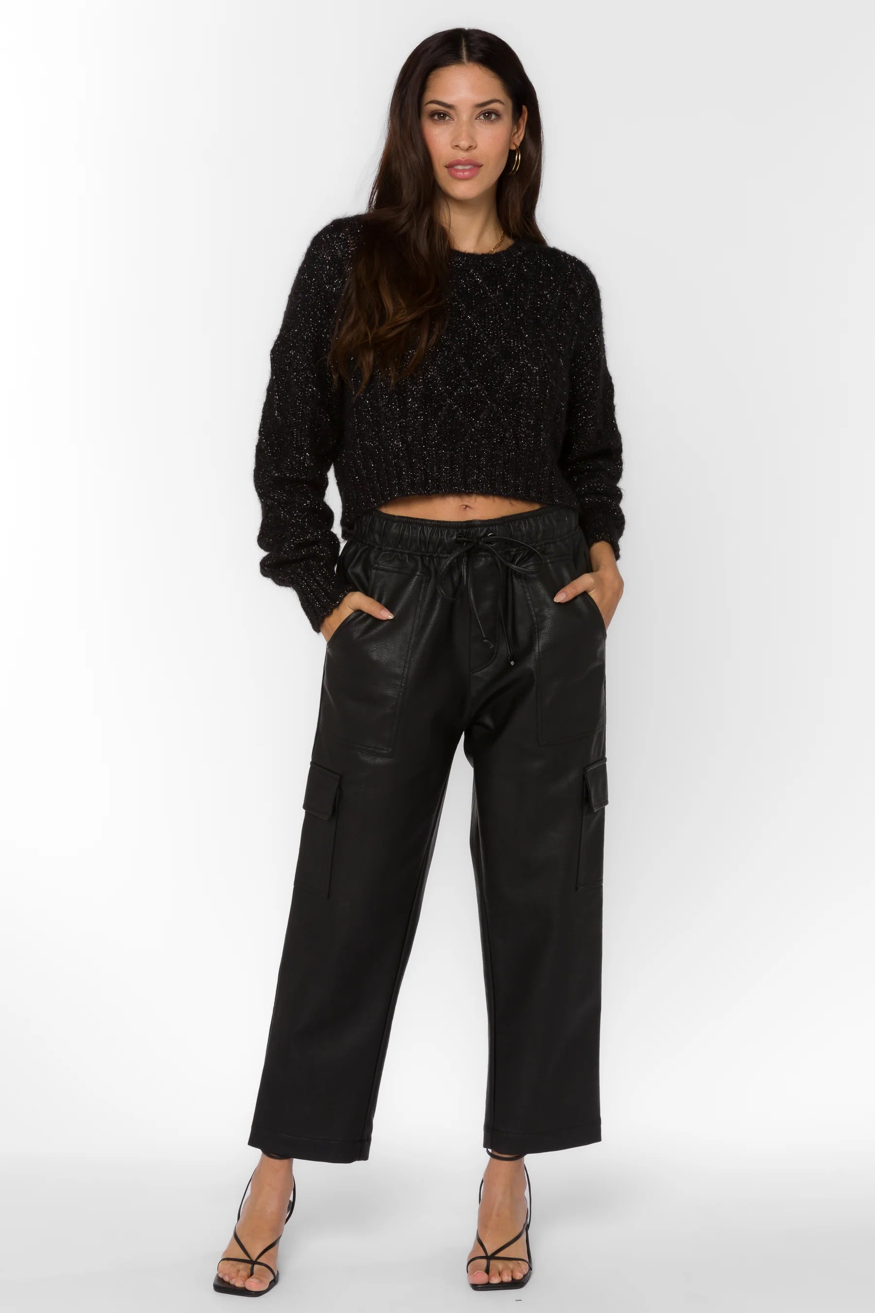 Pullover Cable Knit Design w/Silver Metallic. Cropped Length. 37% Acrylic, 32% Polyester, 13% Metallic, 12% Nylon, 6% Wool.