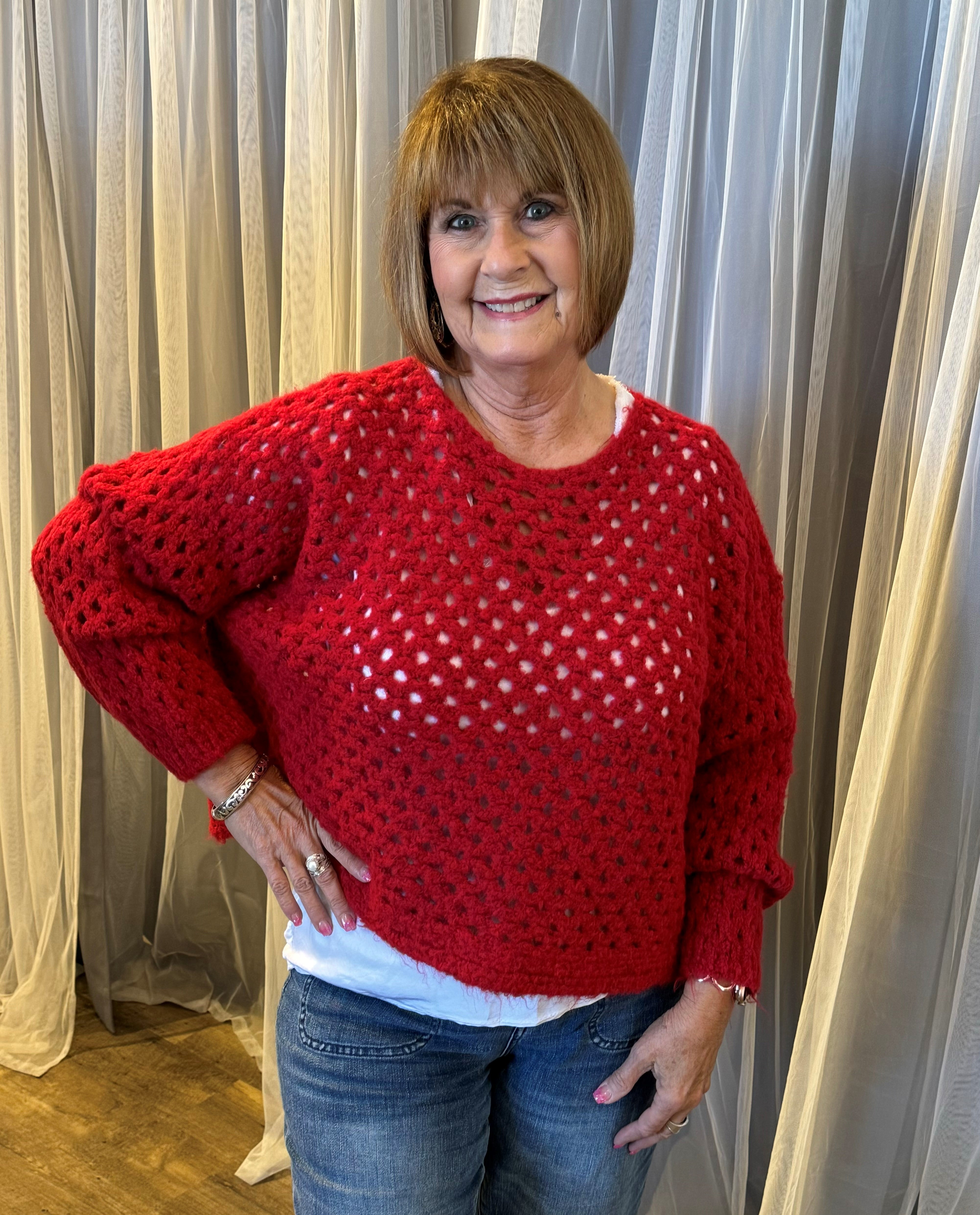 Pullover Open Weave Knit Sweater. One Size. 62% Acrylic. 18% Polyester, 10% Viscose