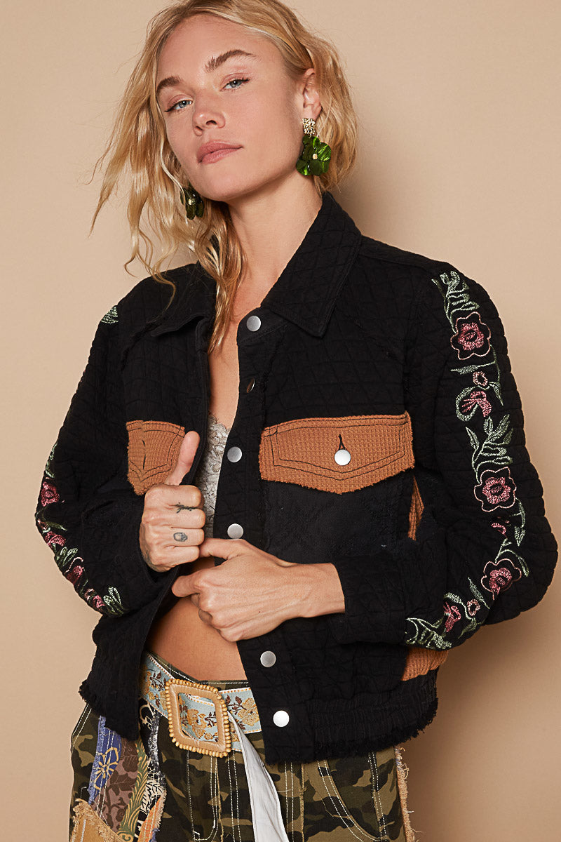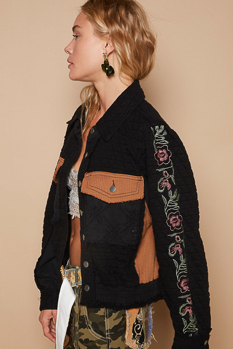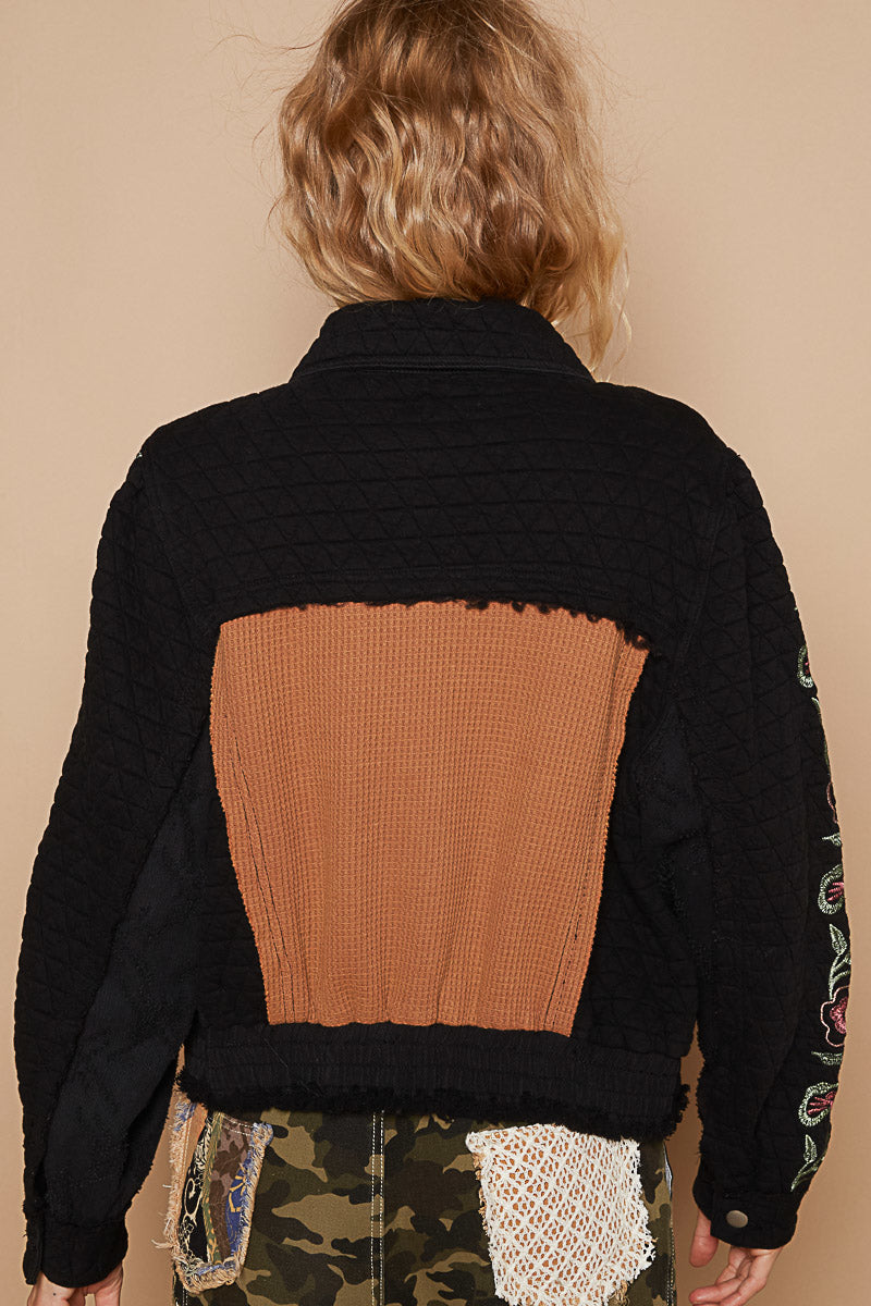 Designed in long sleeve regular fit jacket top in quilting with textured denim patch, out seam, raw edge, smoking opening, front pockets, button down, vintage washing, solid color. 100% Cotton.