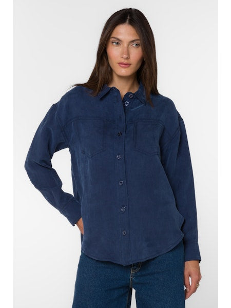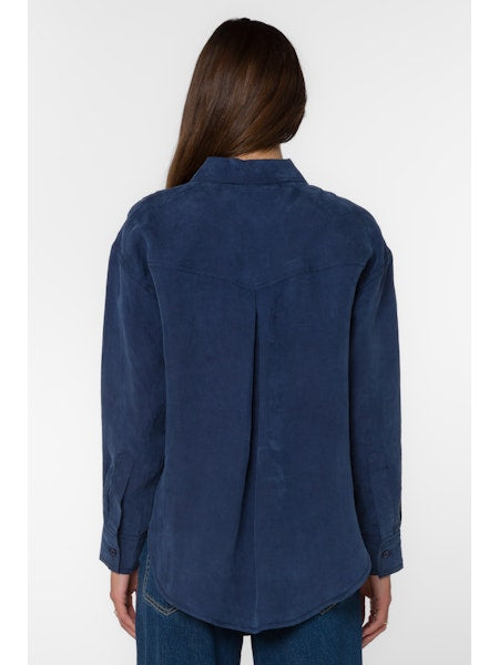 Long Sleeve, Button Up Relaxed Shirt. Chest Patch, Slit Pockets, Shirttail Hem. 60% Cupro, 40% Viscose.