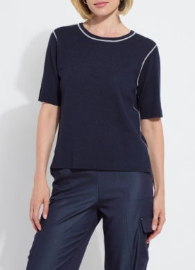 Reversible Knit Short Sleeve Tee. Round Neck. Side Slit at Hem. 40% Rayon, 30% Nylon, 27% Polyester.