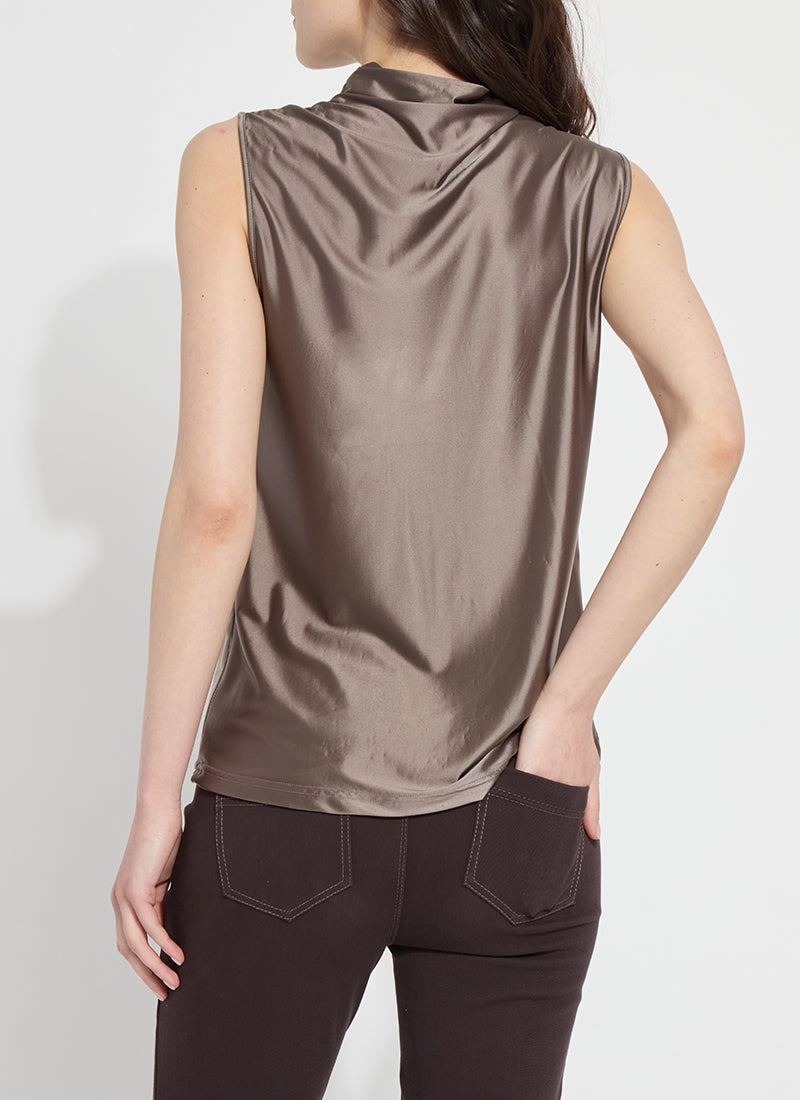 Stretch Satin Jersey. Sleeveless. Mock Neck w/Front Drape.