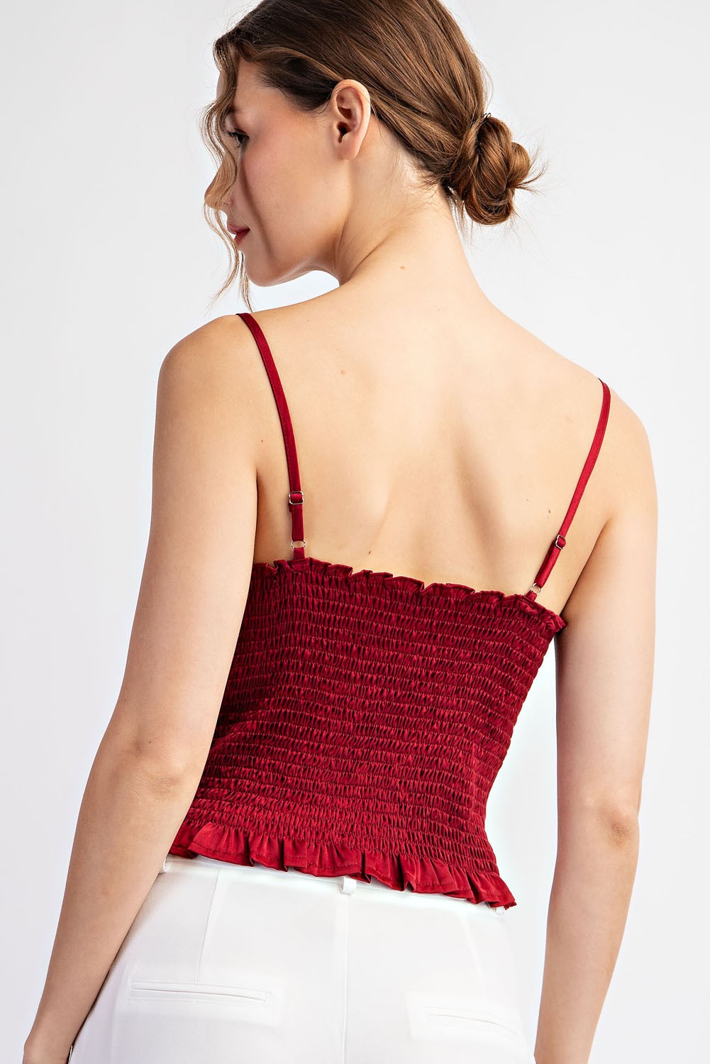 Solid satin sleeveless tank top featuring a cowl neck, adjustable spaghetti straps, a smocked back for added comfort and is a slightly cropped style. 100% Polyester.