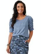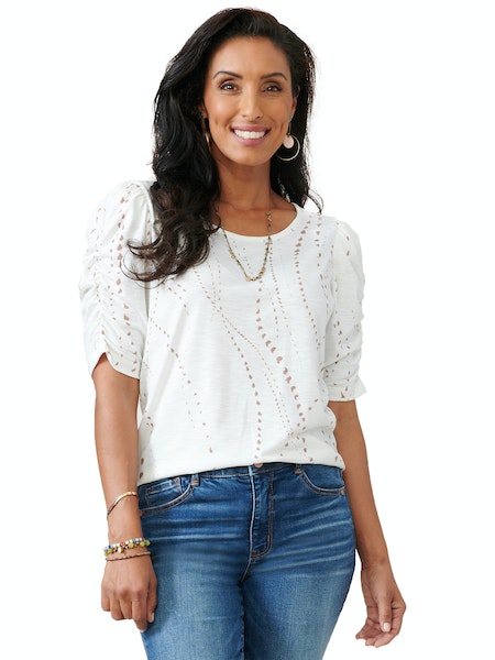 Scoop Neck Print Top w/ Ruched Elbow Sleeve