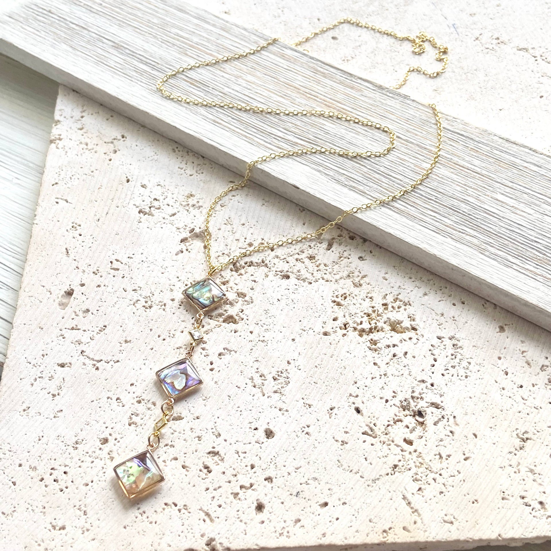 This mother of pearl shell collection is beautiful and makes great gifts. The “flash” of this MOP shell is very eye catching. Tarnish resistant chain.