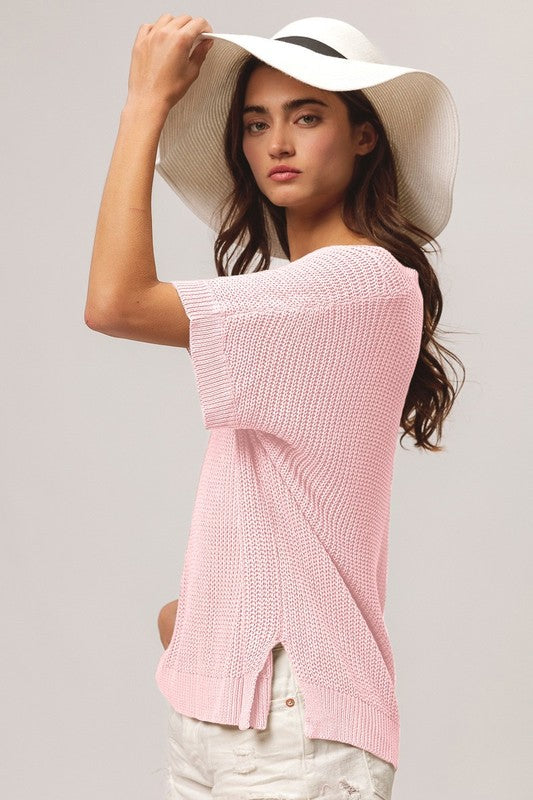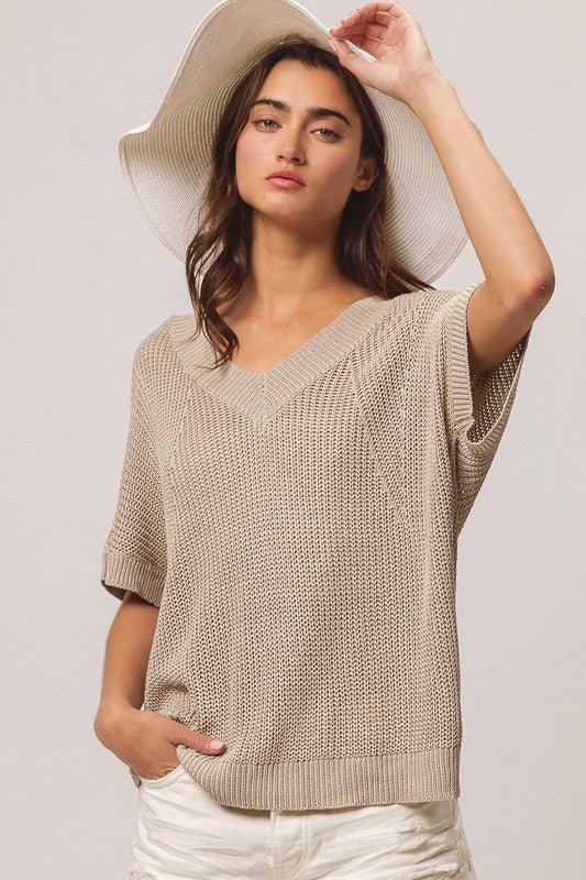 Short Dolman Sleeve Lightweight V-Neck Sweater. 60% Polyester, 40% Viscose