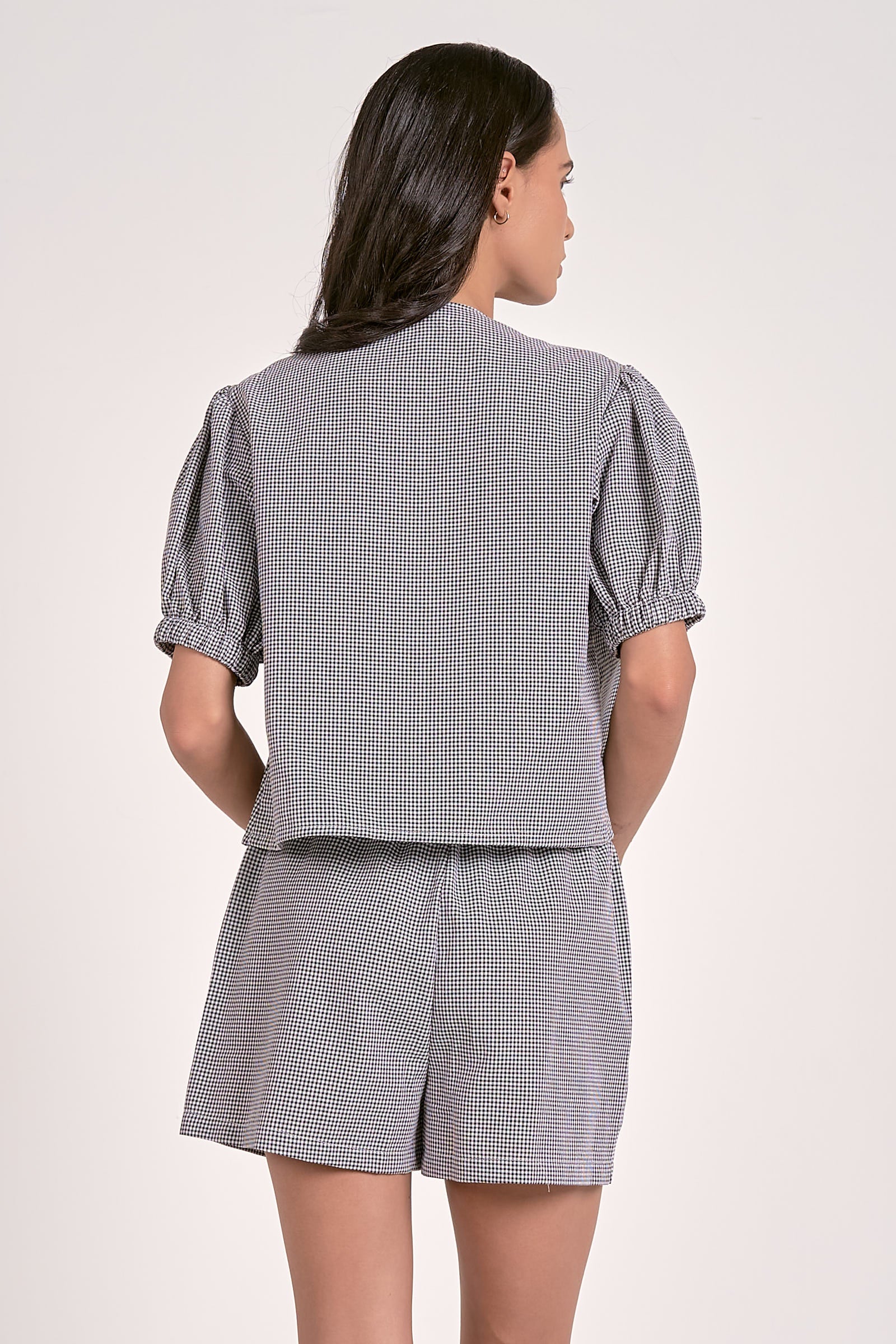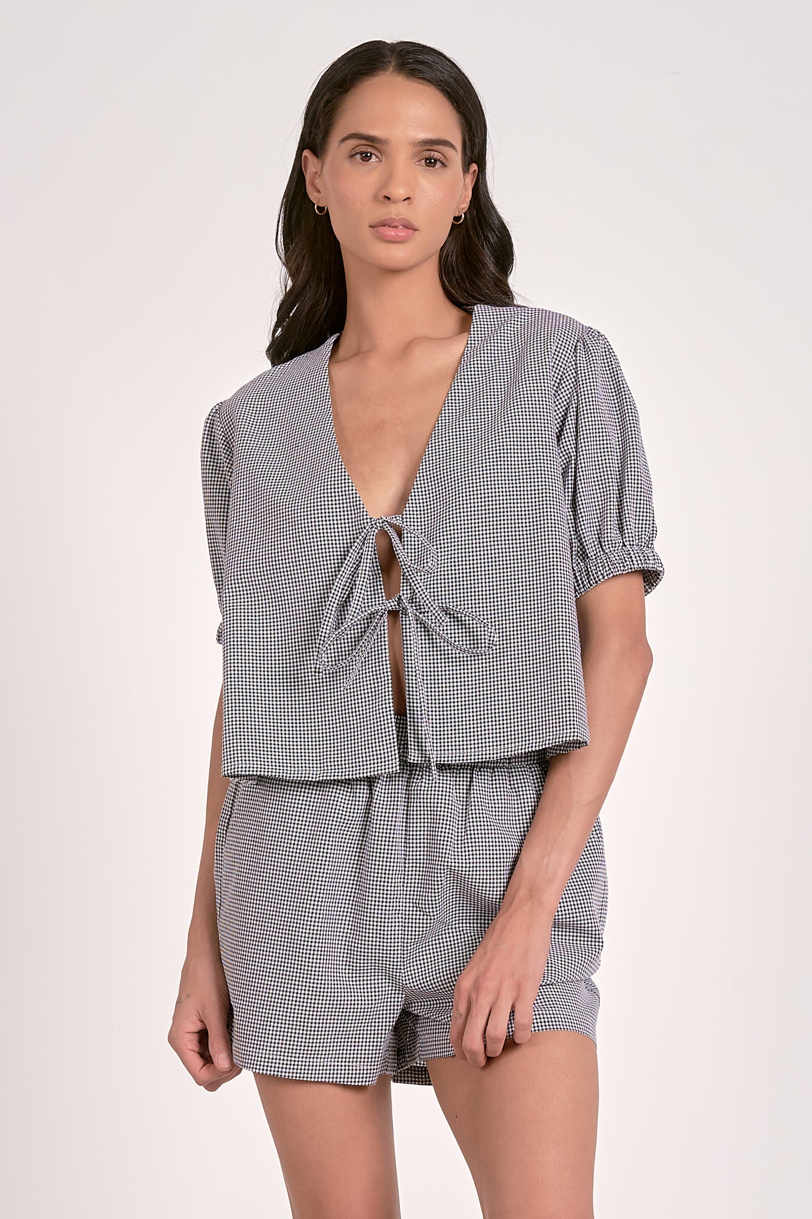 Tie Front Gingham Printed Top. Black Seersucker.