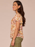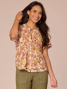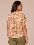 Short Sleeve Stand Collar Button Down Placket Printed Woven Top