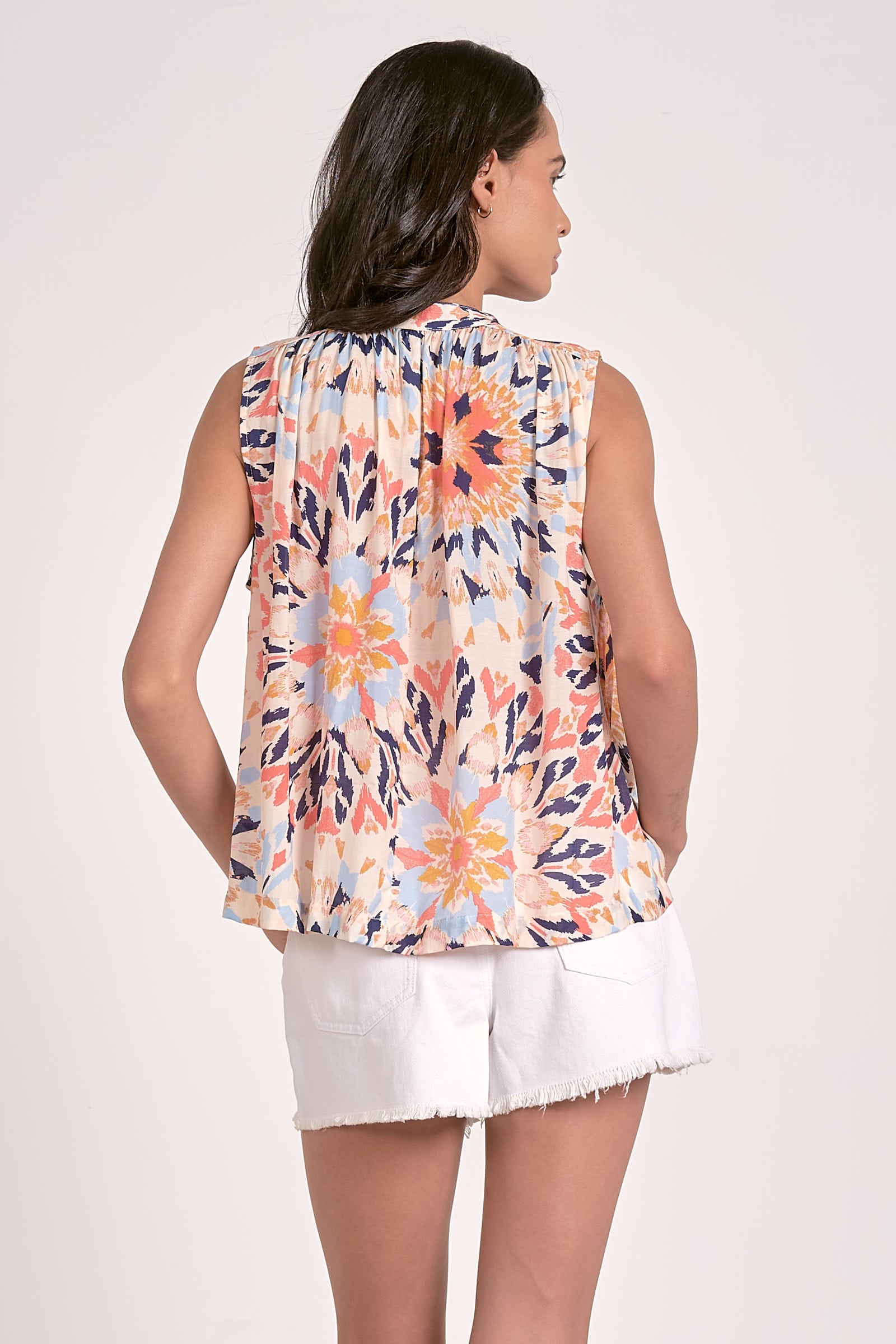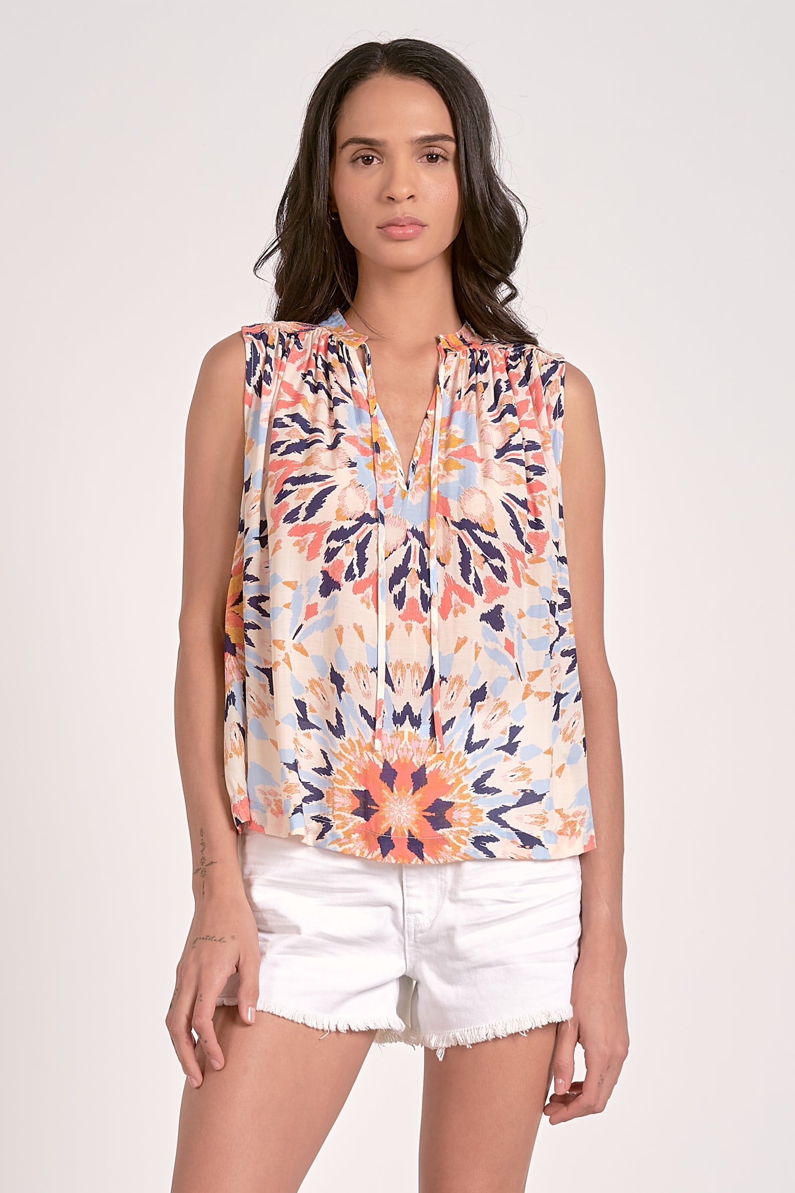 Sleeveless Flowy Top w/ Tie Neck. 100% Viscose.