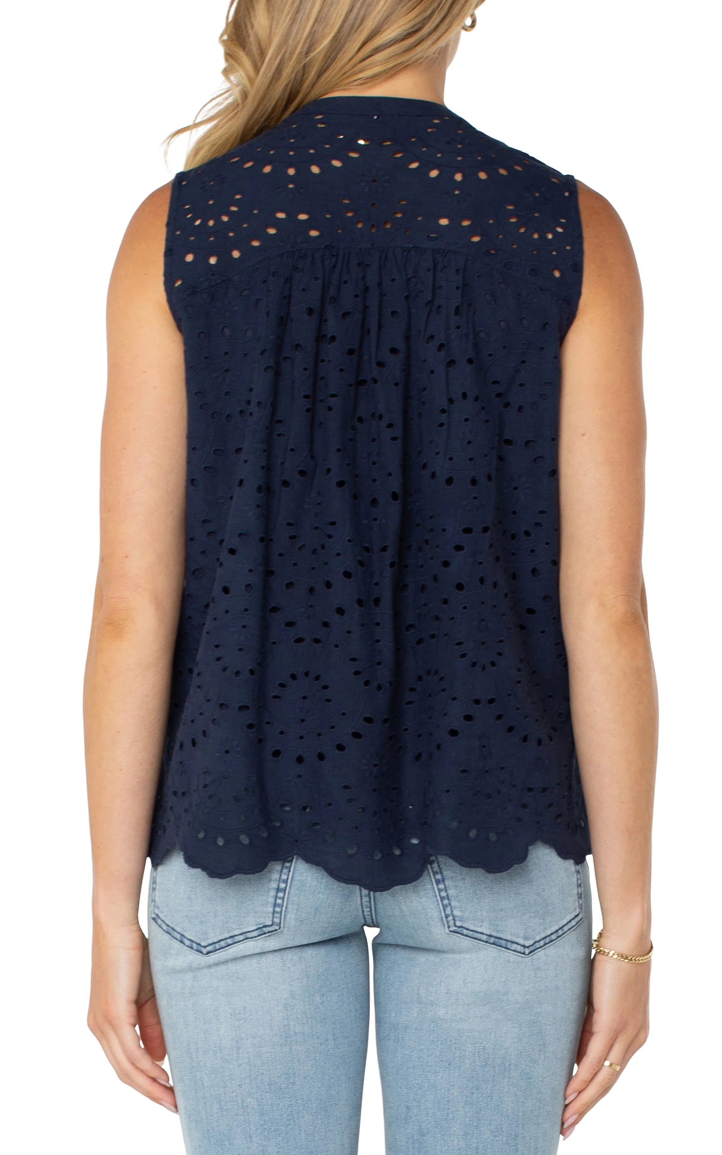 This sleeveless halter boasts a striking scalloped finish for a touch of sophistication. The front pintuck details add texture and definition to the silhouette, creating a refined and tailored appearance.