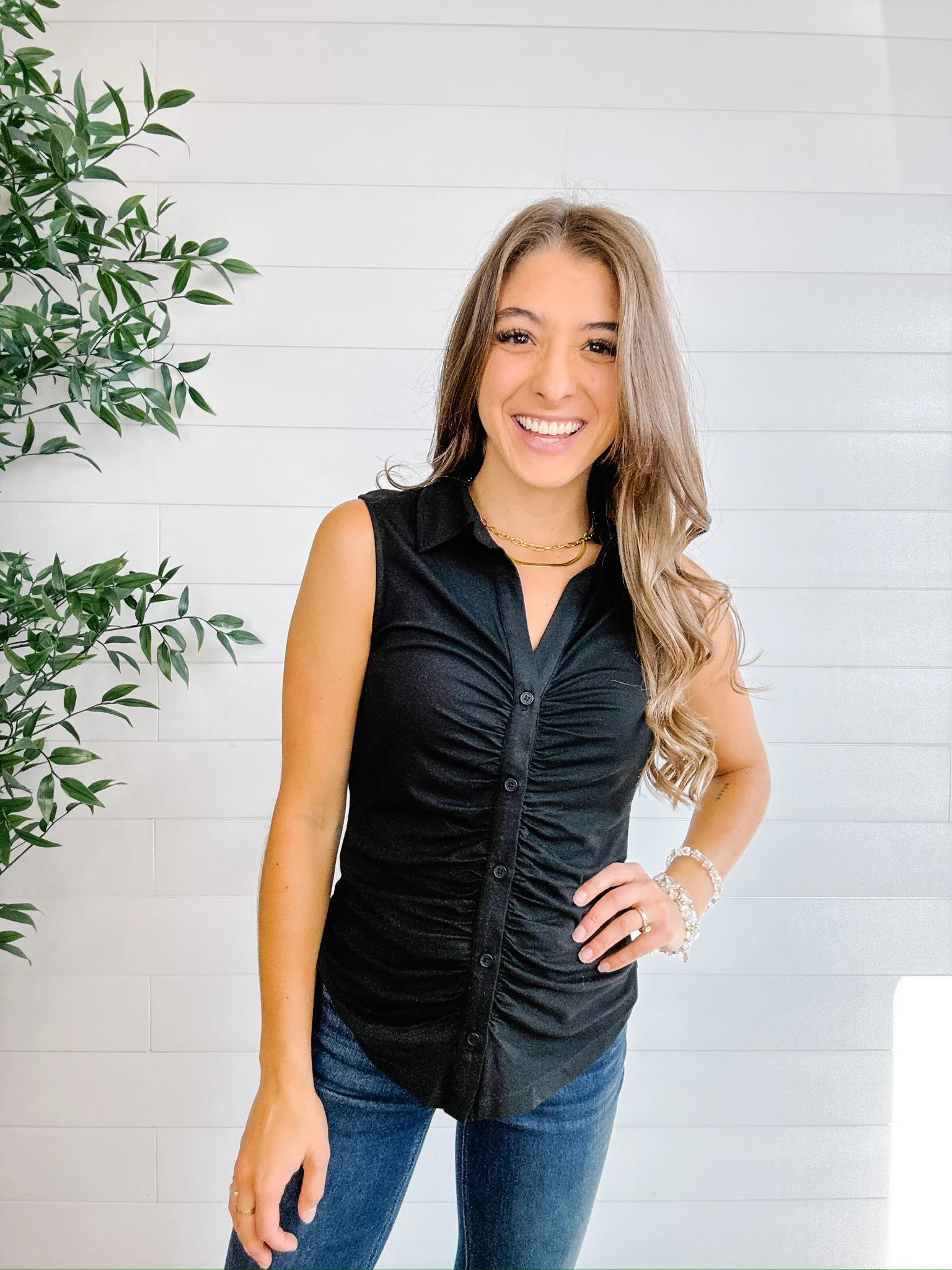 Sleeveless ruched button front top