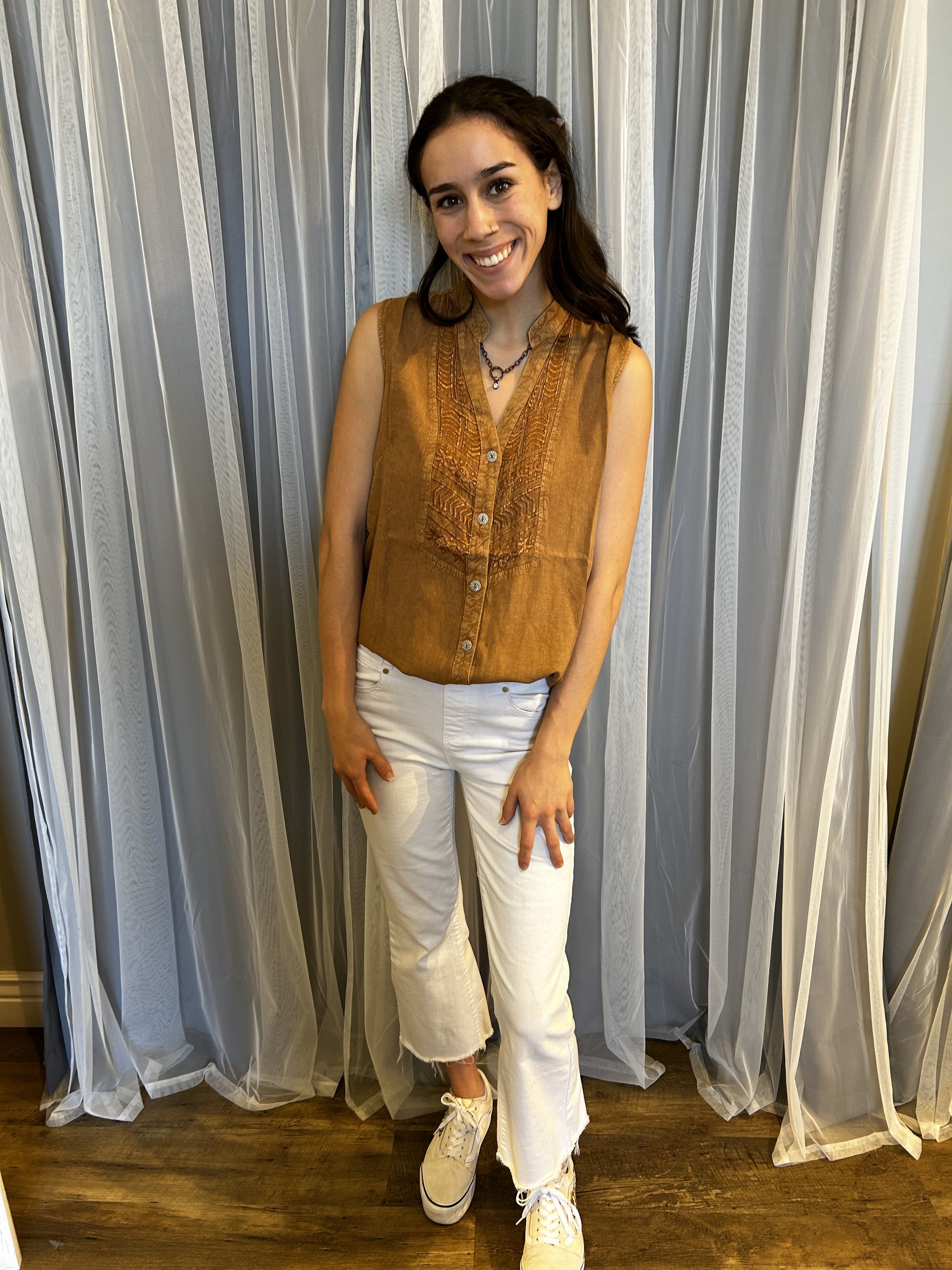 Sleeveless Top w/ Embroidery and Metal Buttons