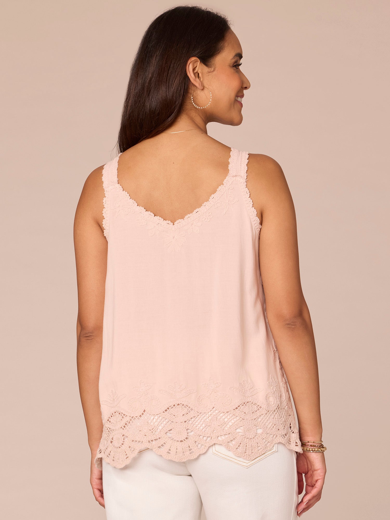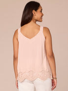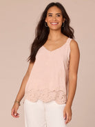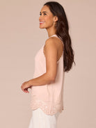 Sleeveless V Neck Embroidered Scallop Edge Hem Woven Tank Top