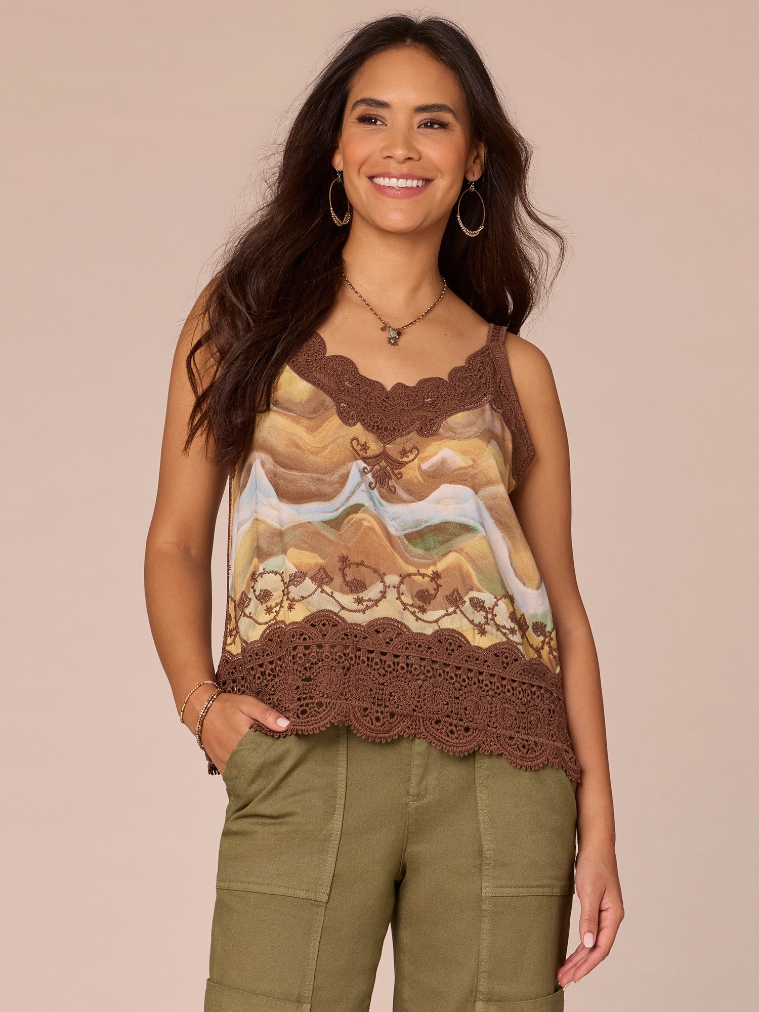 Sleeveless V Neck Scallop Edge Printed Embroidered Tank Top