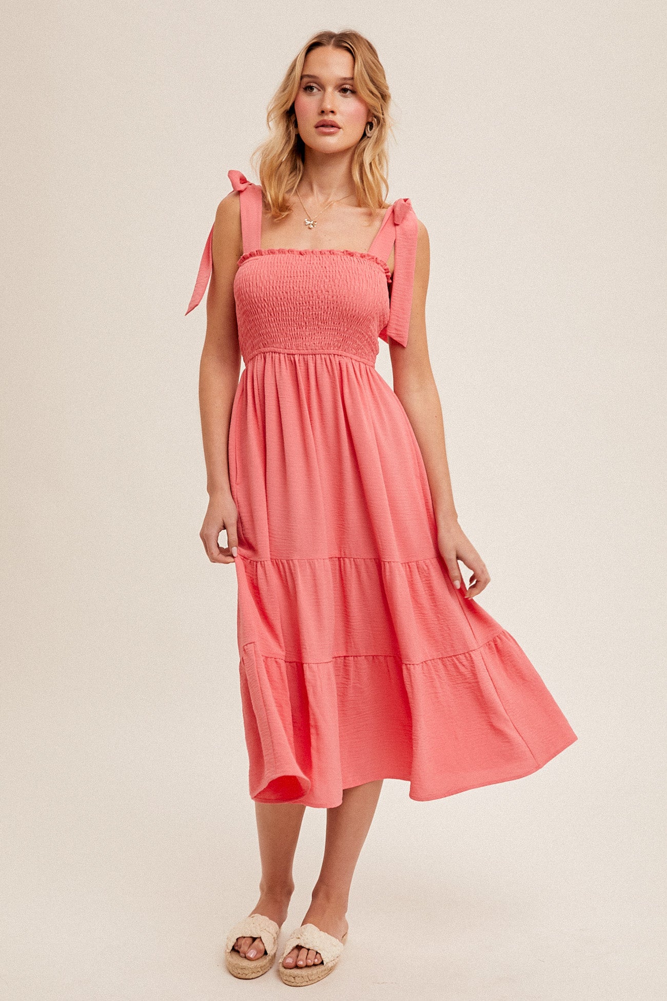 Smocked Bodice Tie Strap Tiered Midi Dress