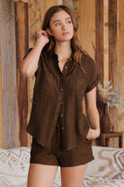 Collared, Button Down w/Front Pocket. 64% Rayon, 36% Polyester.