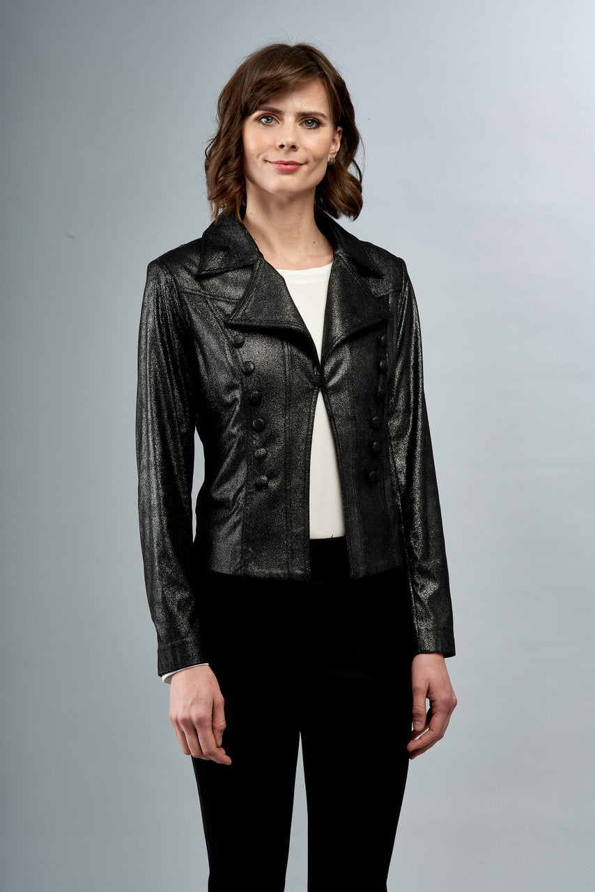 Solid Vegan Leather w/Buttons. Black w/Sparkle. 90% Polyester, 10% Spandex.