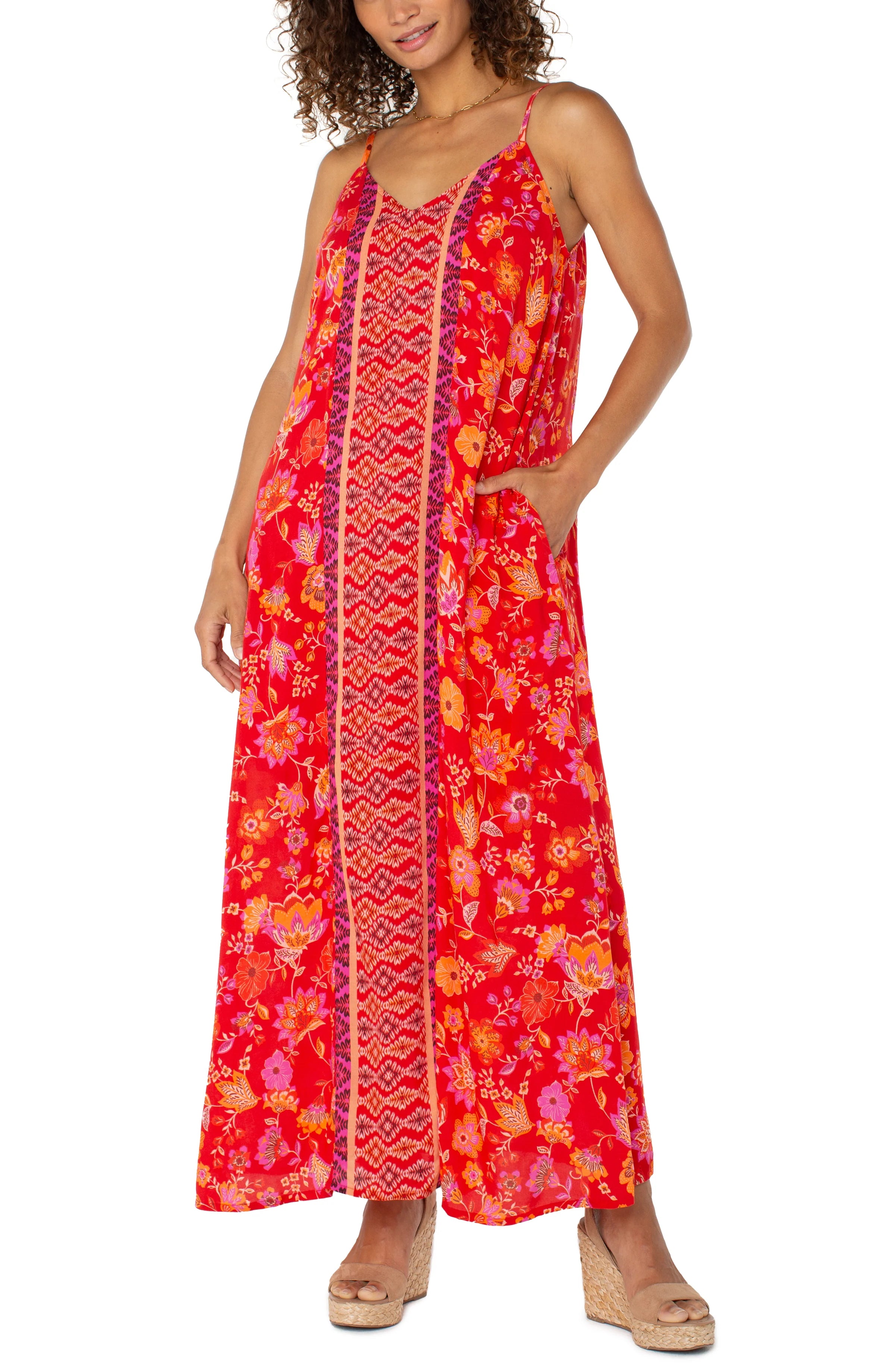 This effortlessly chic spaghetti strap maxi dress perfectly blends vibrant style and breezy comfort. Ideal for everything from casual beach days to garden parties, this dress can be dressed up with heels or kept laid-back with sandals. Its lively pattern and lightweight fabric make it your go-to piece for a relaxed yet polished look.