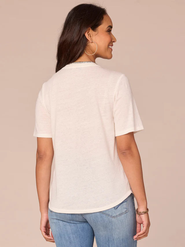Short Sleeve V-Neck Contrast Blanket Stitch Pocket Knit Top. 55% Linen, 45% Polyester.
