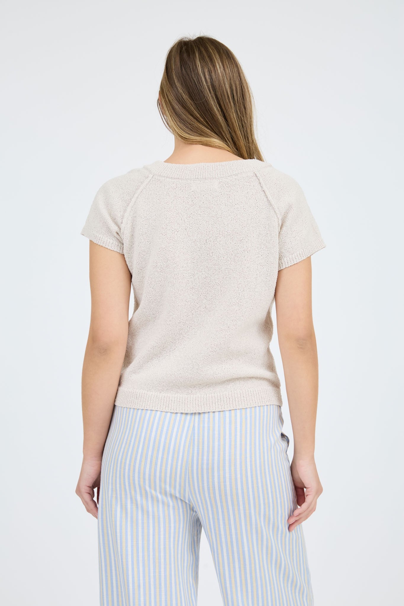 V-Neck Short Sleeve Exposed Seam Sweater Top. Ribbed Trim. 100% Polyester.