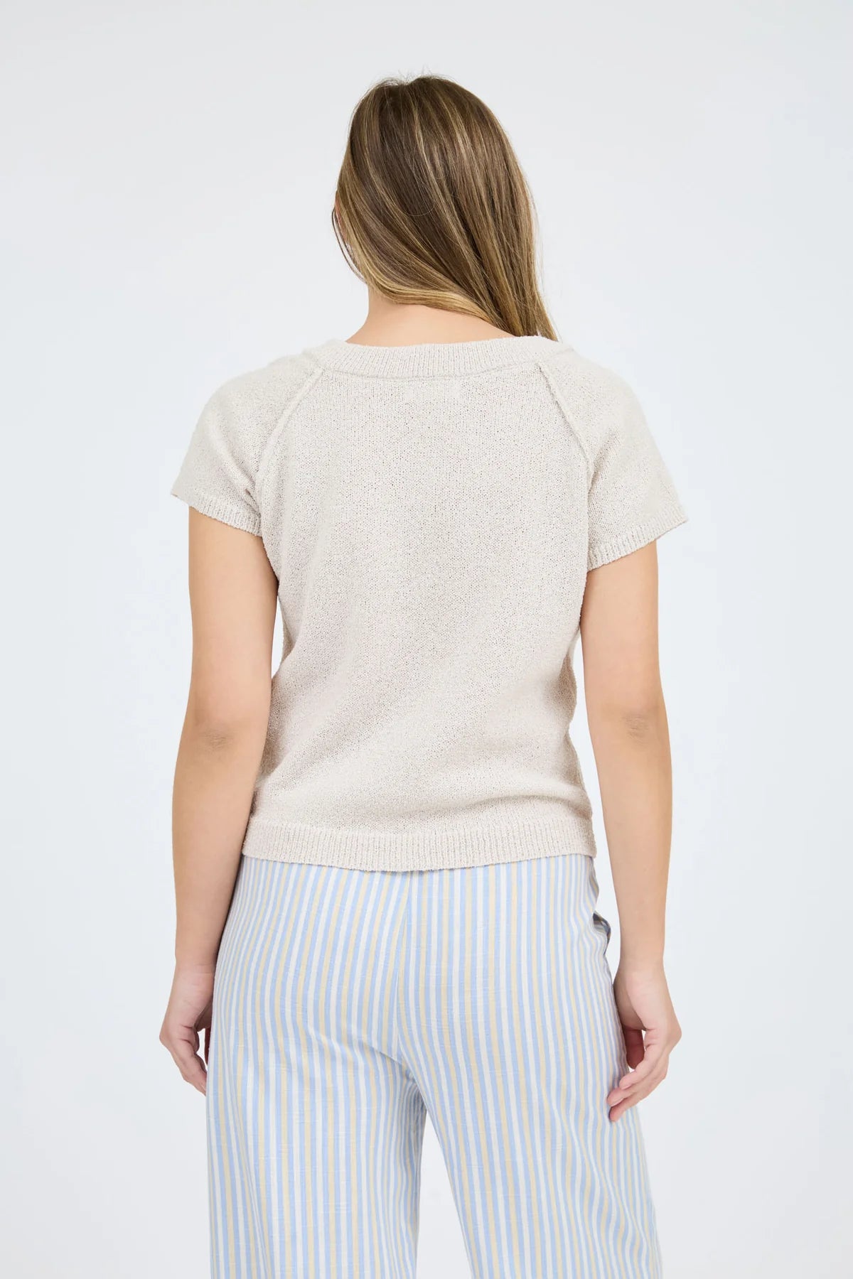 V Neck Short Sleeve Exposed Seam Sweater Knit Top. 100% Polyester.