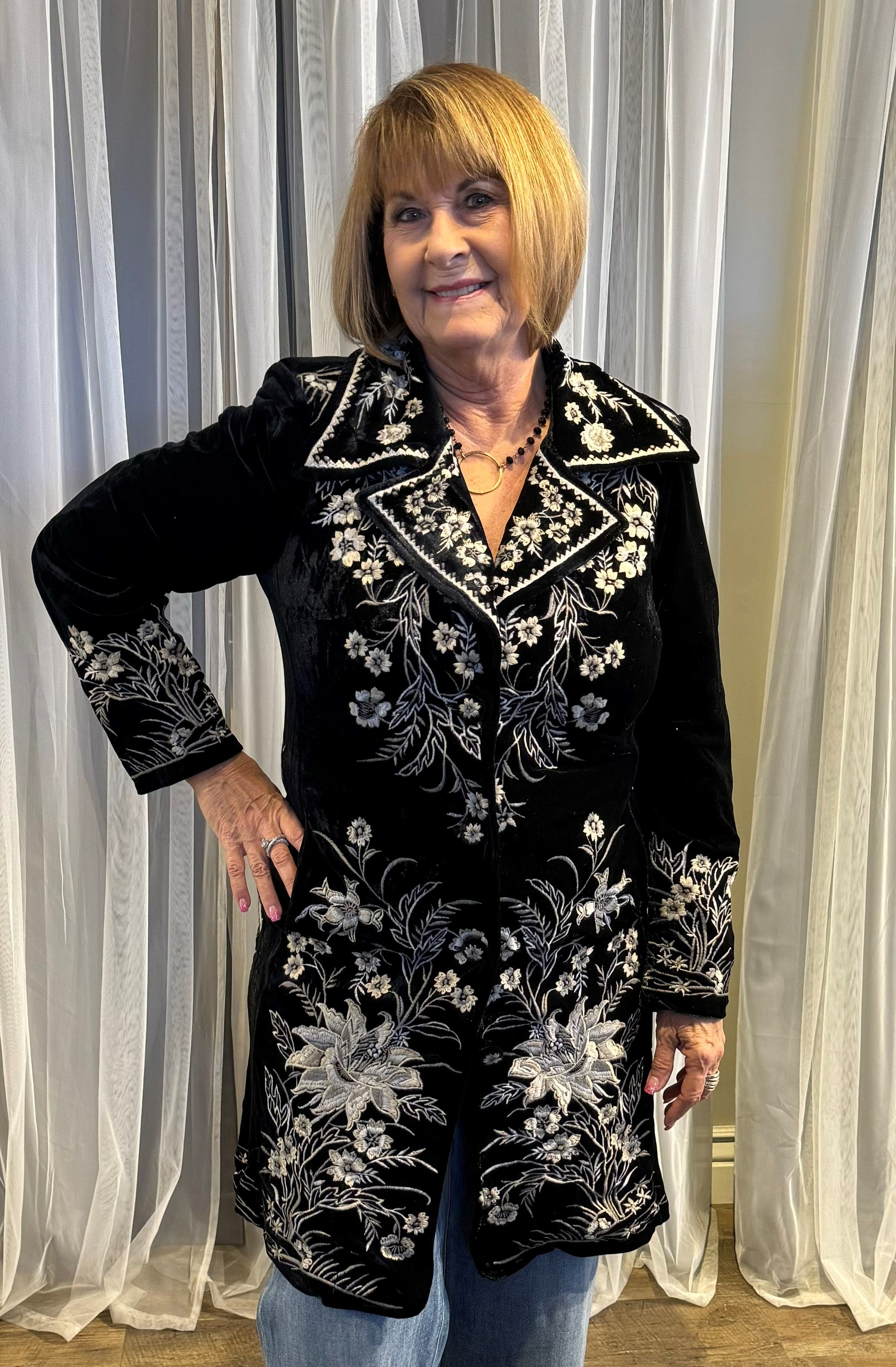 Full Length Velvet Coat w/Embroidered Embellishment. Button Front. 95% Polyester, 5% Spandex. Machine Wash Cold Inside Out. Hang to Dry. No Iron or Dry Clean.