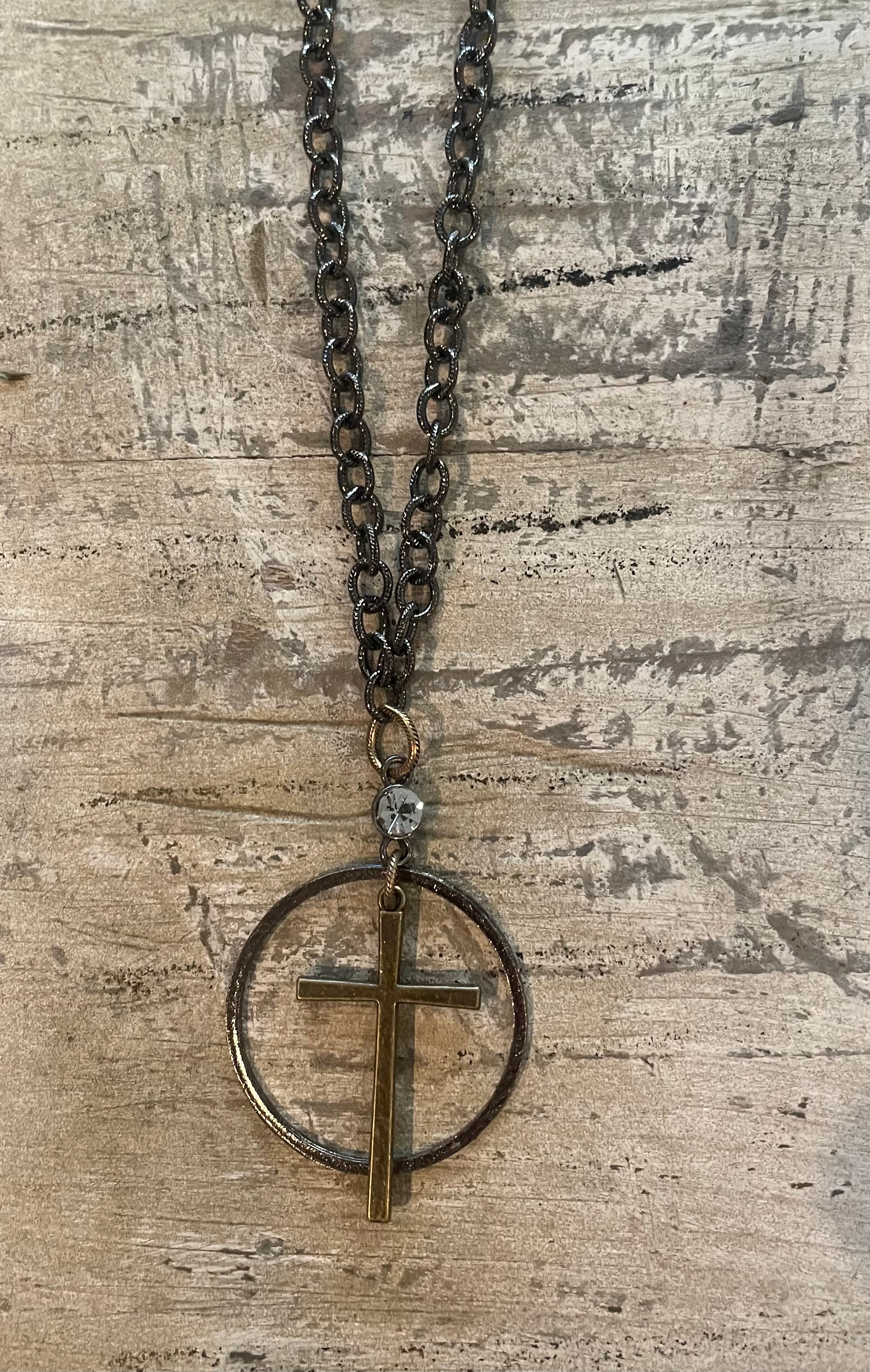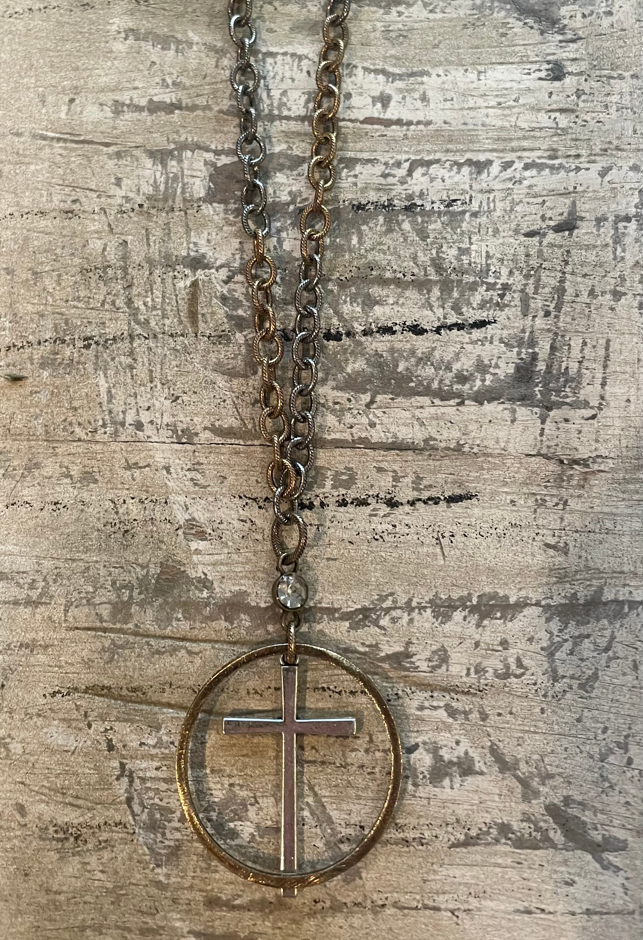 Vintage Inspired Cross w/ Hoop on Mixed Metal Chain
