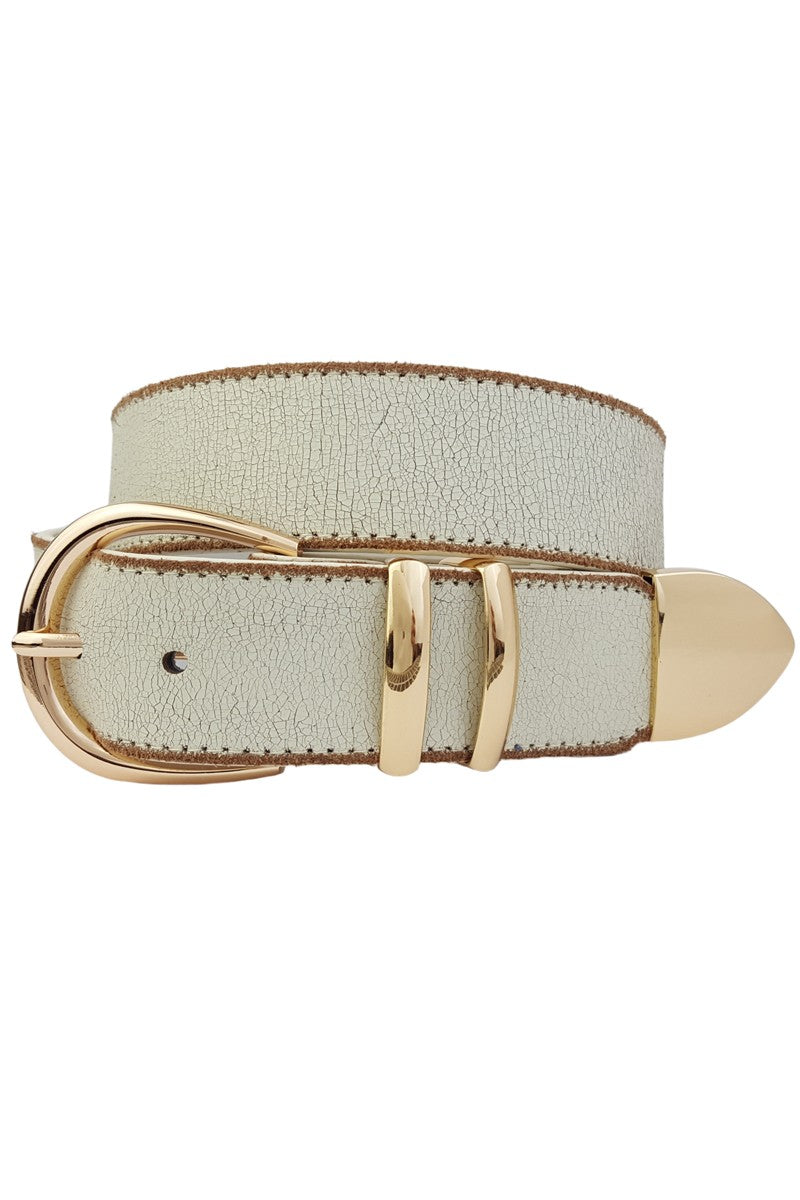 Vintage Leather belt with Shiny Gold Buckle set Belt strap in genuine cow leather, with distressed and vintage effect In black or cream color. Shiny Gold Buckle set includes double metal loop and a metal tip Width is 1.5" or 38 mm , Fits perfect for jeans Very vintage white leather and edge is sand-off to show the distress look!