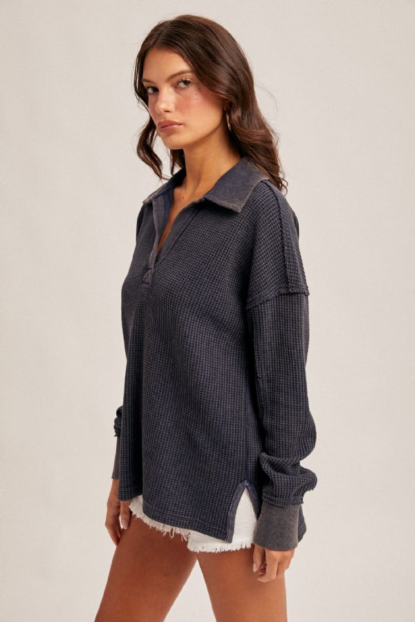 Washed Thermal Oversized Top. 65% Polyester, 35% Cotton.